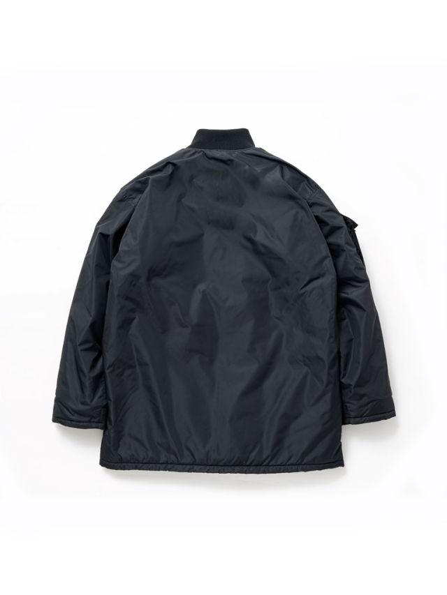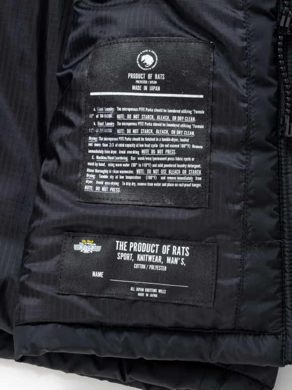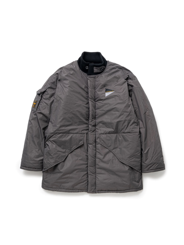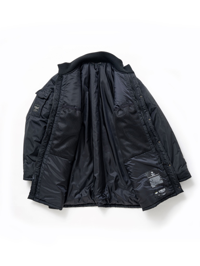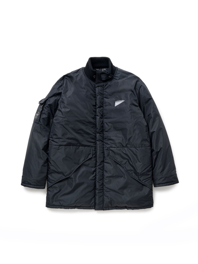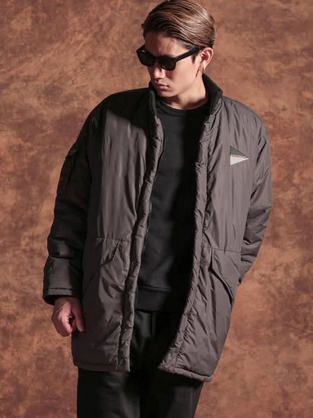 表地に撥水性に優れたナイロンを使用し、裏地にはリップストップナイロンを使用し、リブ襟の付いたミリタリーベースで作れたスタンドカラータイプのリブパデットコートです。