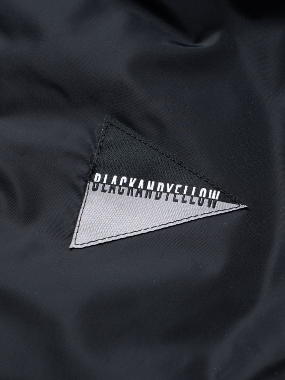 襟にはボタン留めのチンストラップ、左胸にフラッグモチーフのラバープリント、フロント両脇に大ぶりの変形スラッシュポケット、右袖にフラップポケット、身頃の内側左右にも大ぶりのメッシュポケットを配置したマルチファンクションデザインです。