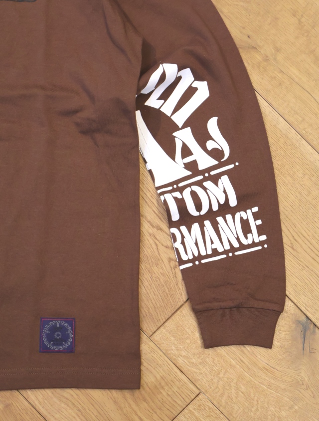 左胸にブランド定番の焼き印ロゴをプリントし、両袖内側にAAAデザインのグラフィックのプリントが入ります。