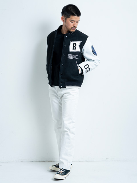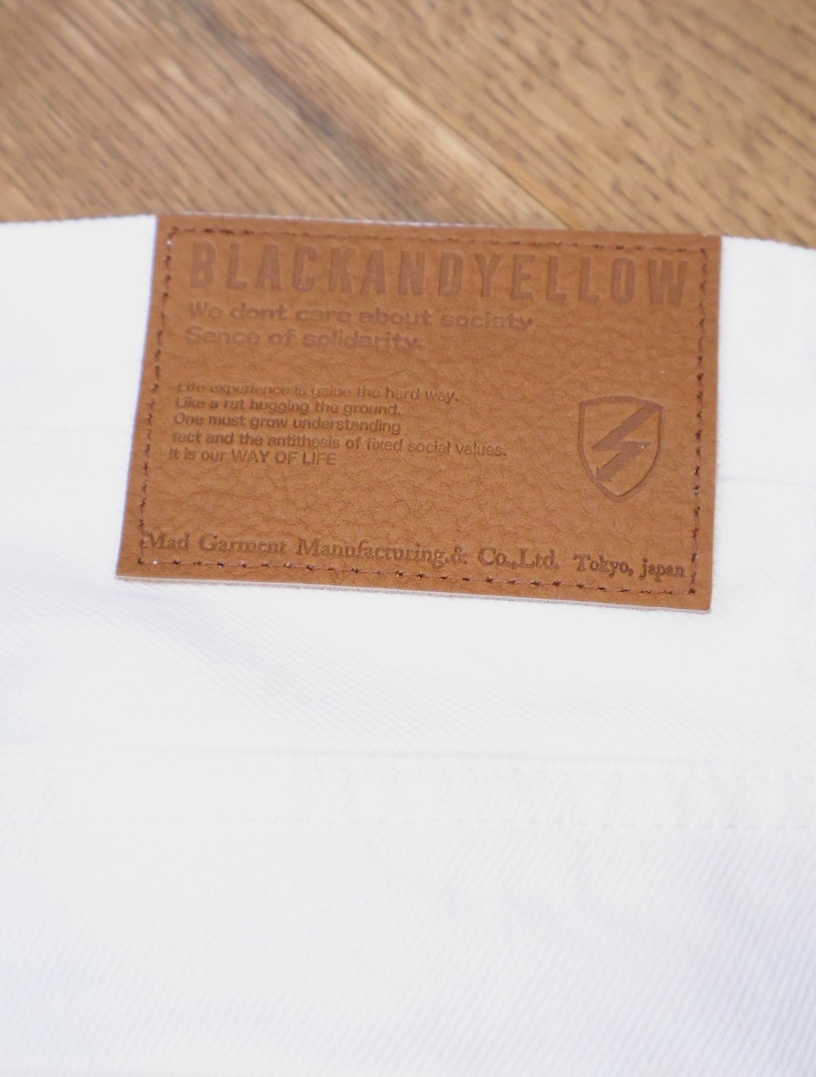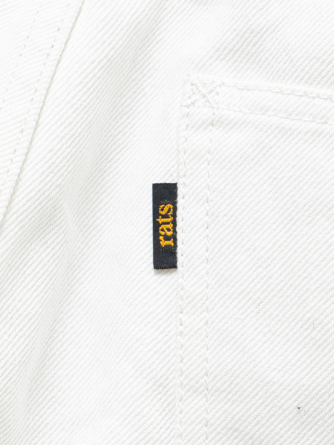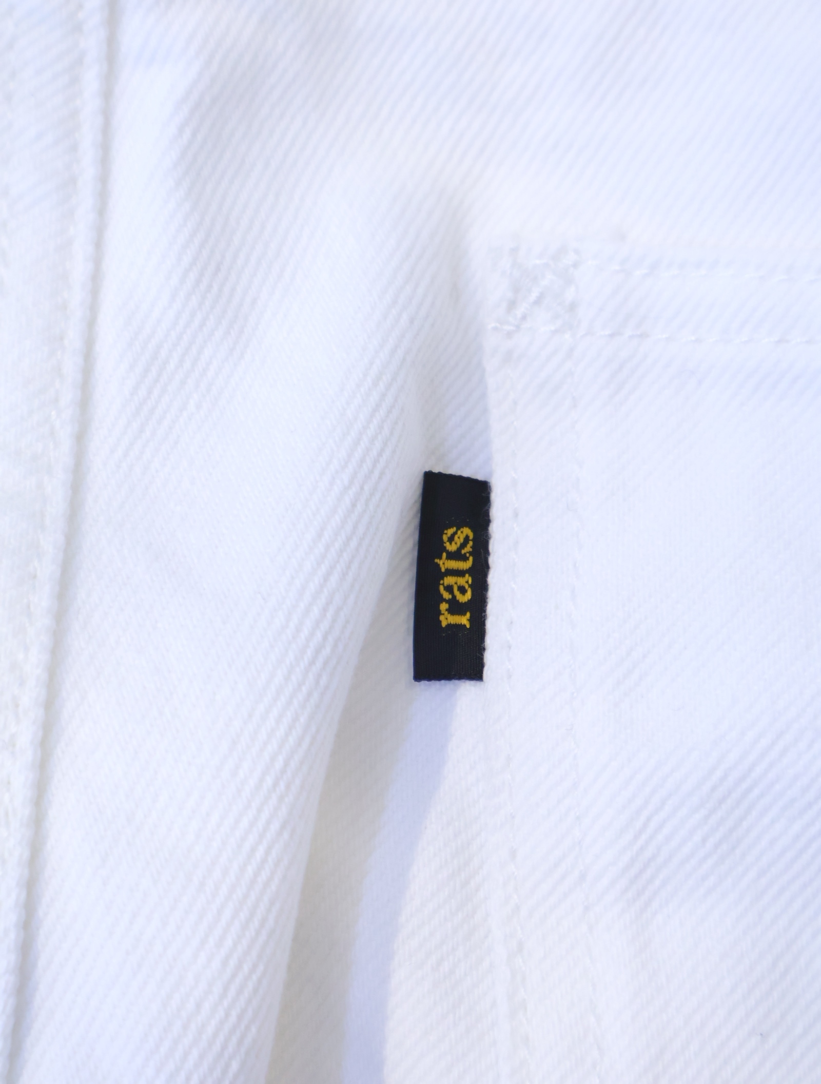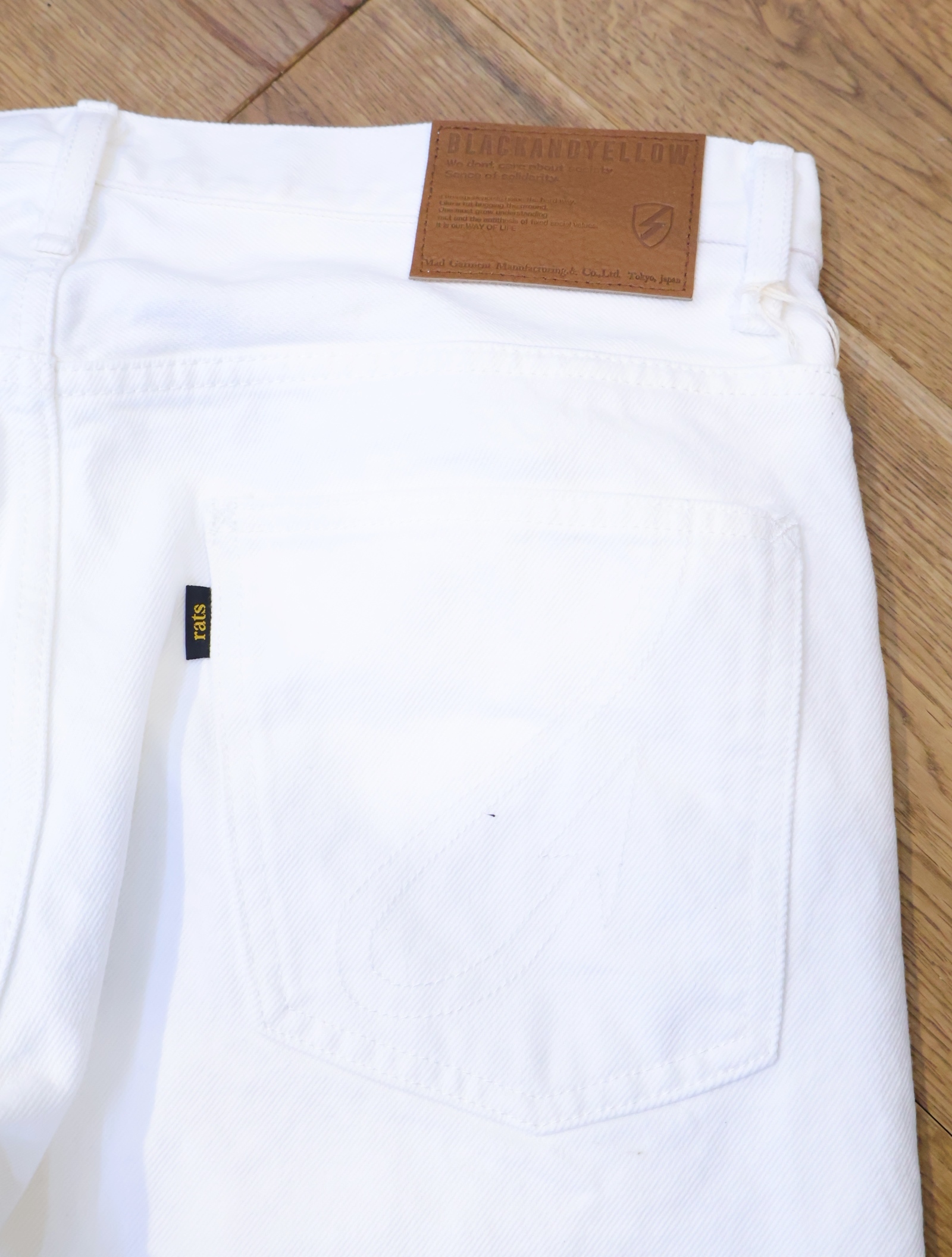 右腰にBLACK AND YELLOWの刻印が入るレザーパッチを叩きつけ、ヒップポケットにはRATSデニムのアイコン、Ratテールの同色ステッチが施されたデザイン。