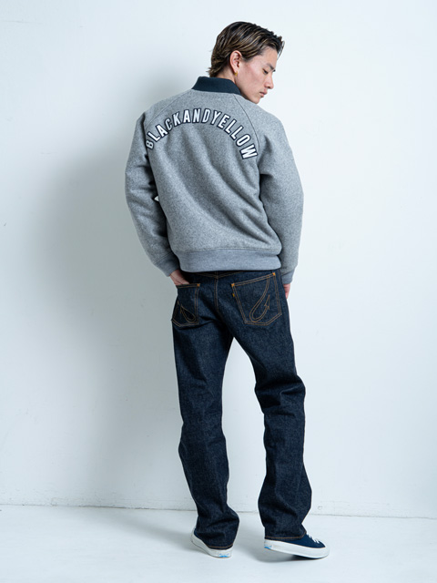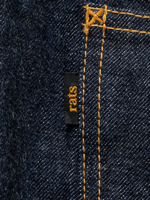 右腰にBLACK AND YELLOWの刻印が入るレザーパッチを叩きつけ、ヒップポケットにはRATSデニムのアイコン、Ratテールのステッチが施されたデザイン。