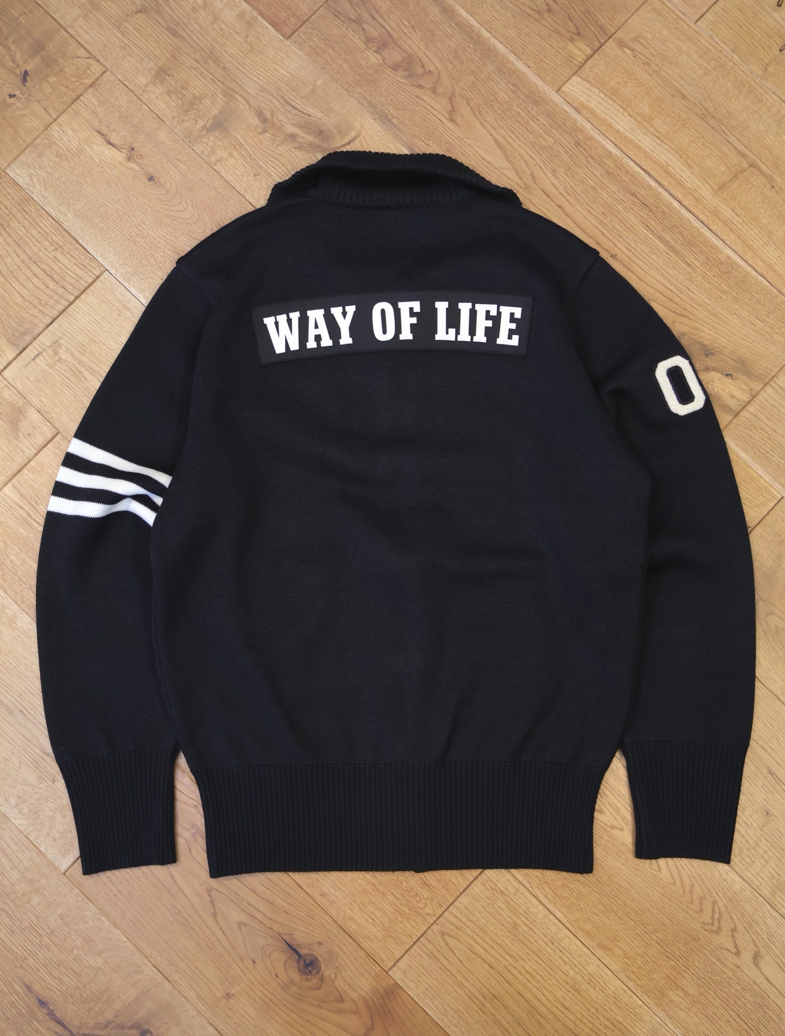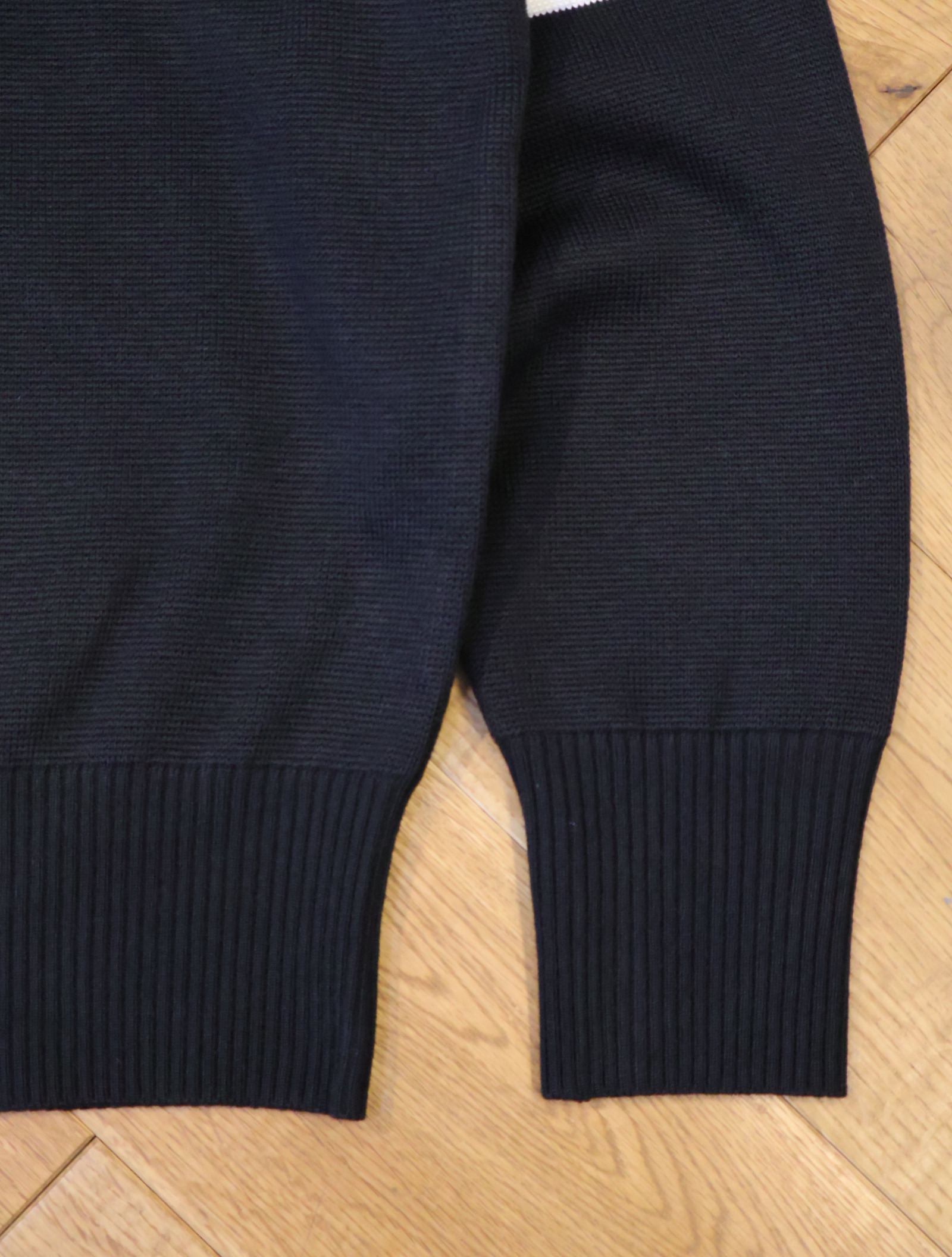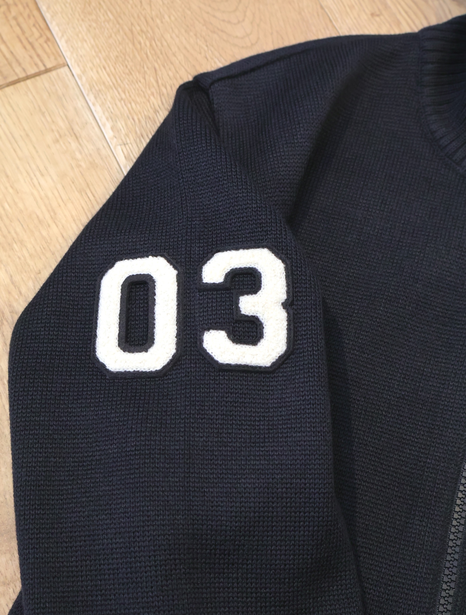 左袖にはジャガードで三本ラインのデザインが入るなど細部にまで拘られたアイテムです。