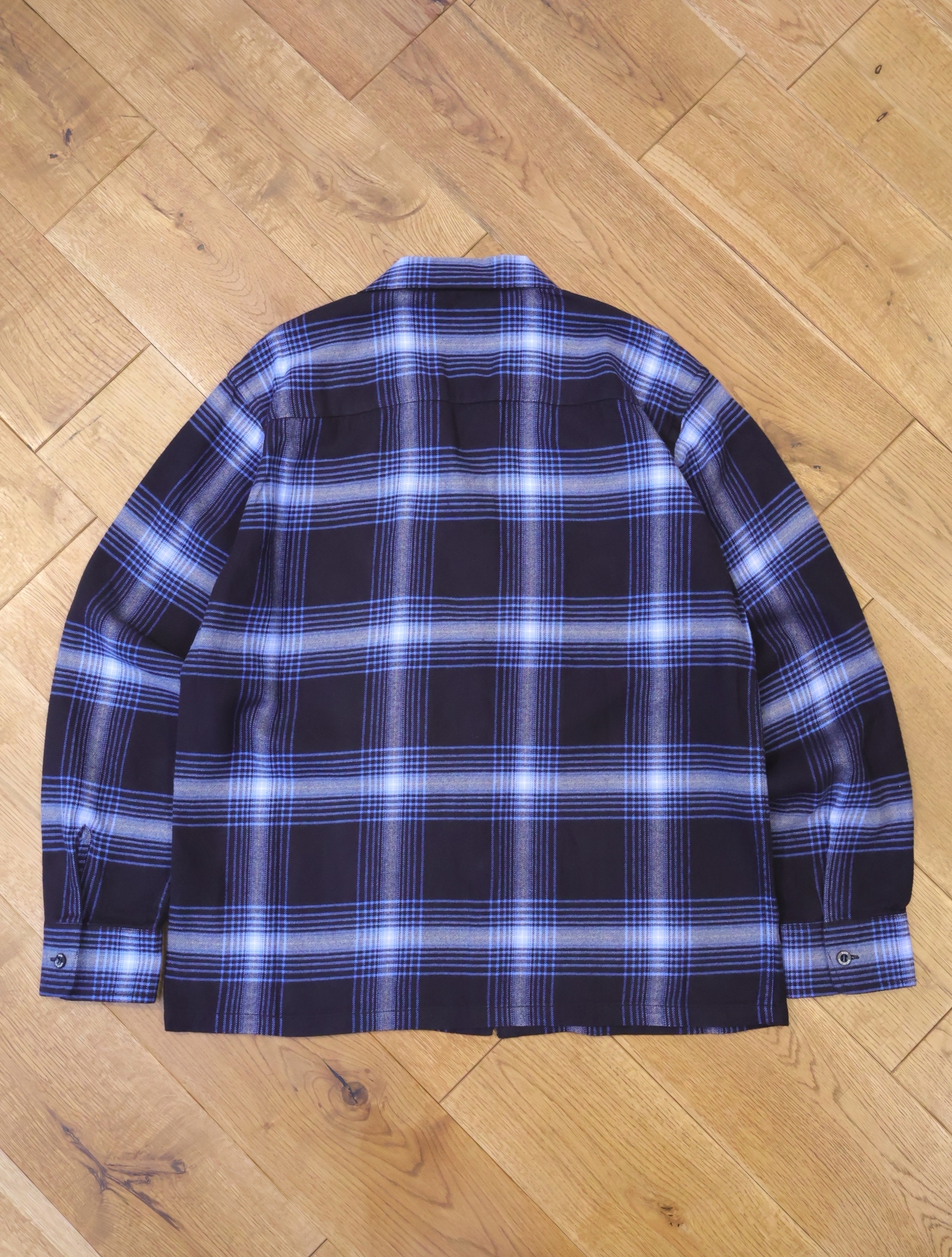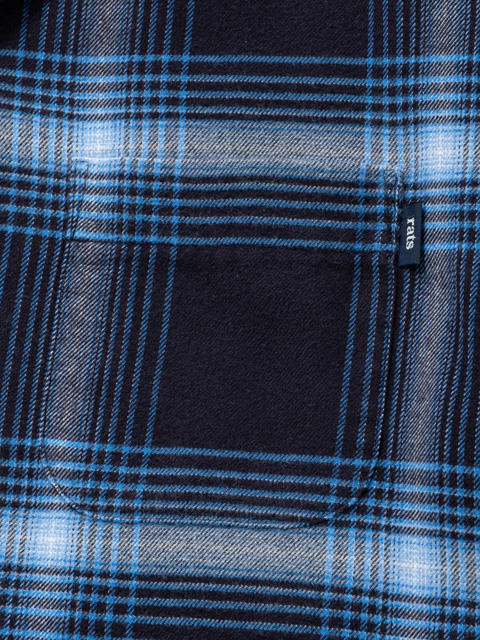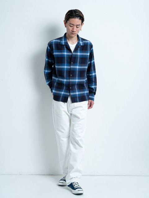 微起毛させたコットン/レーヨン混紡素材で作成したオリジナルチェック柄生地を使用したオープンカラーシャツです。