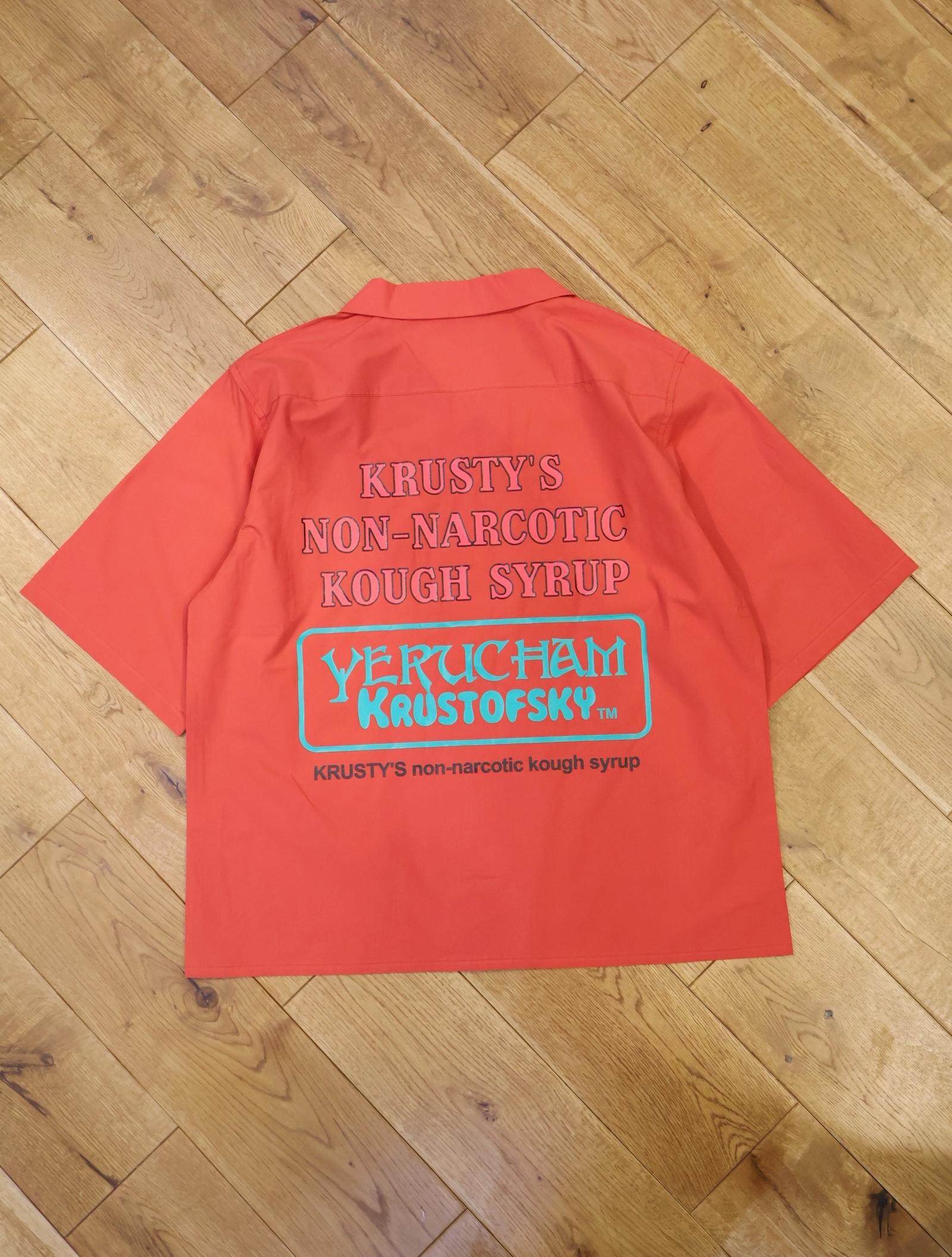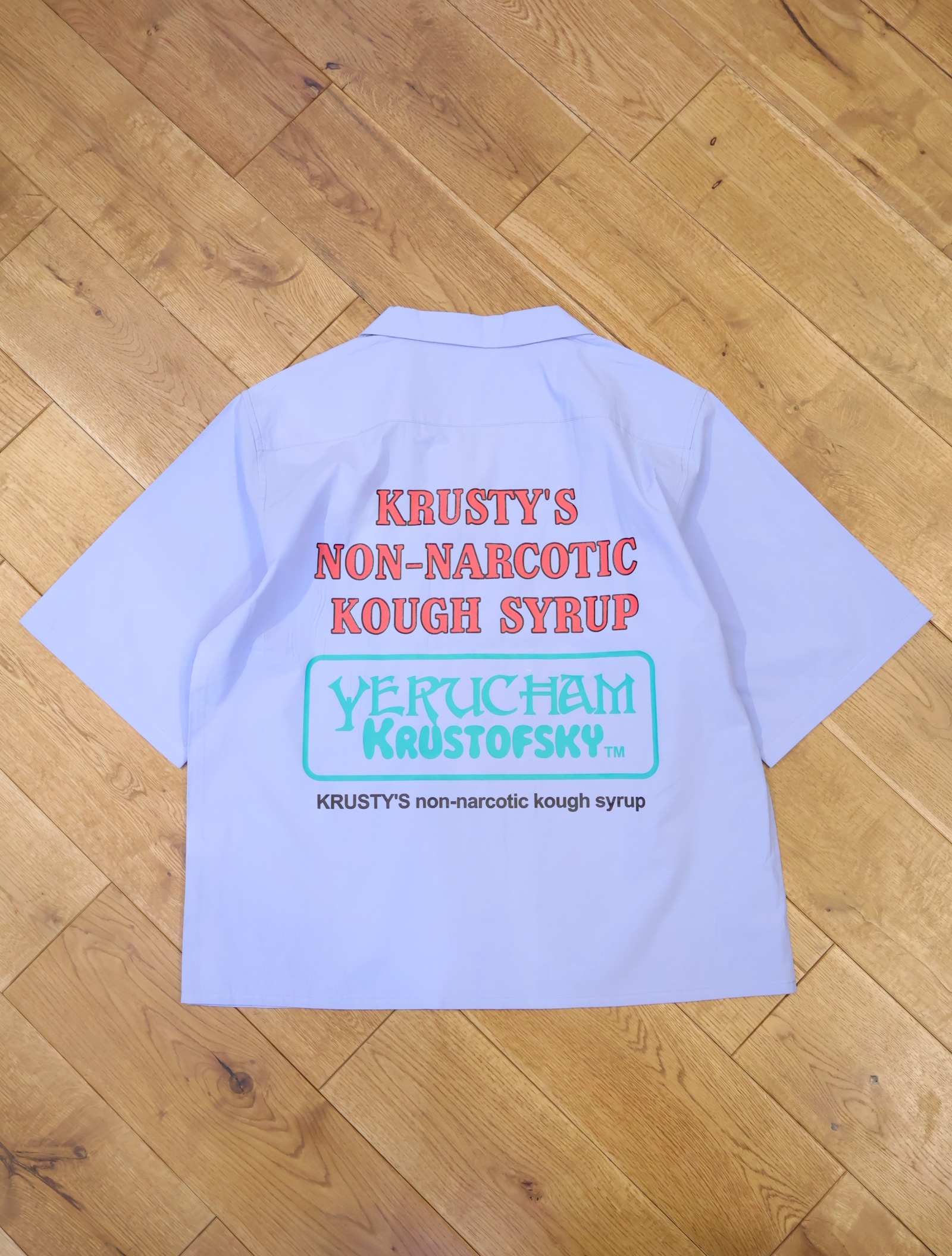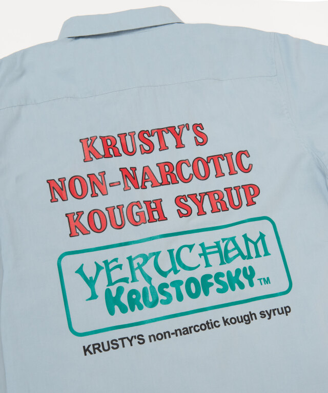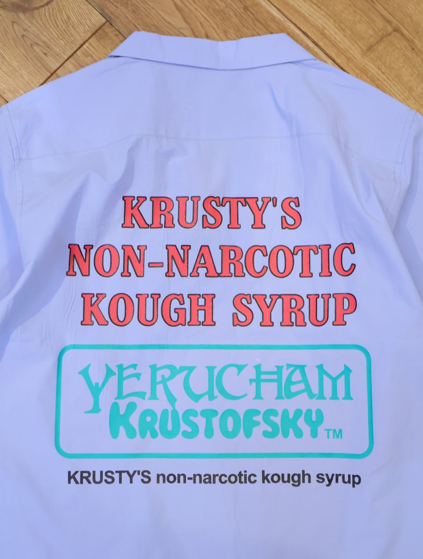 シンプソンズの登場人物”クラスティー・ザ・クラウン”の咳止めシロップが売っているドラッグストアの制服をイメージした半袖シャツ。
