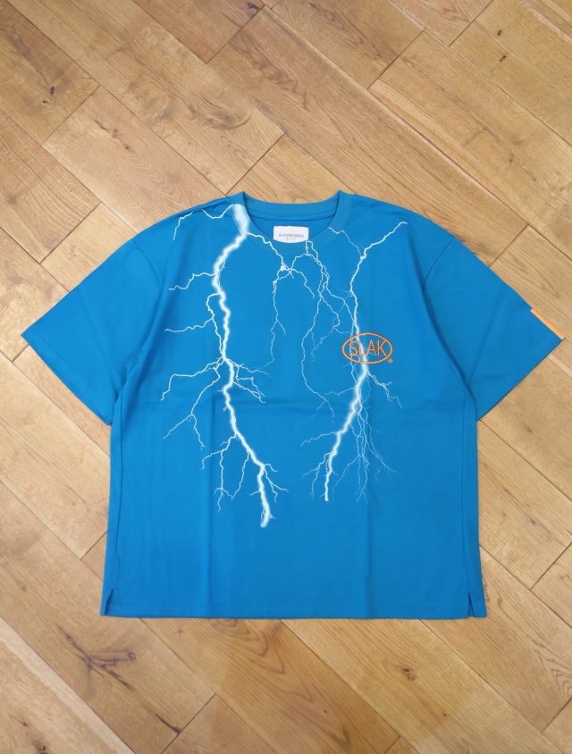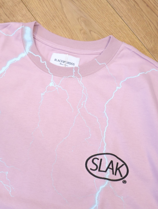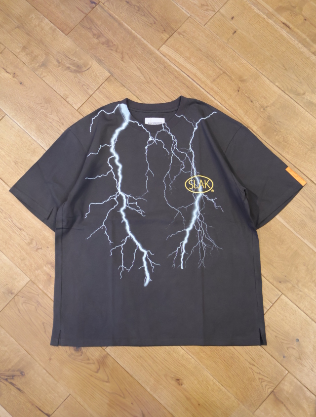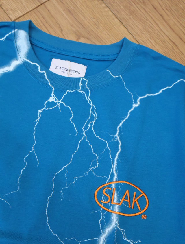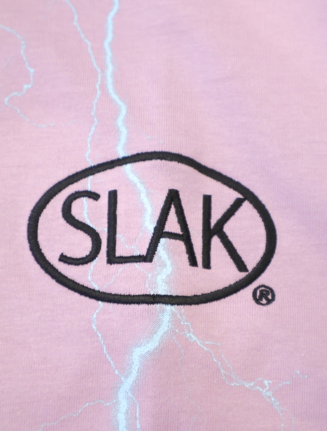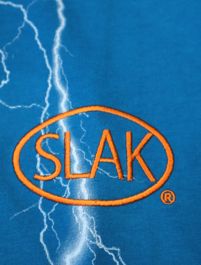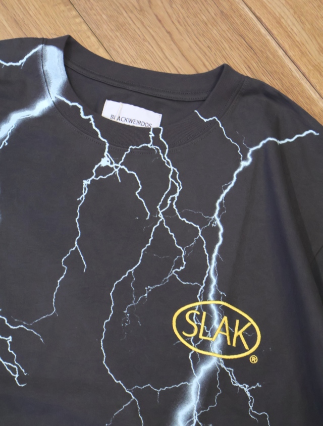 80年代のハーレーダビッドソンの古着ティーシャツによくある稲妻プリントと胸部にプロダクトなSLAKロゴが刺繍されたハードロック調のデザインです。
