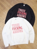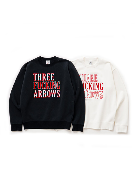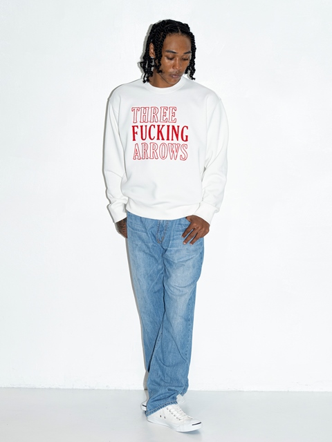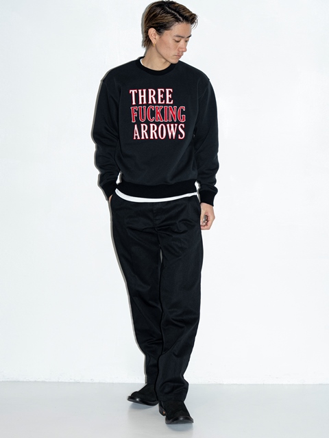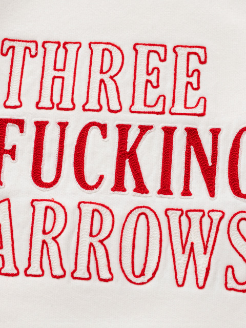 セットインスリーブのレギュラーフィットなシルエットで作製されており、フロントに‘‘THREE FUCKING ARROW‘‘のレターグラフィックをチェーンサガラ刺繍で叩きつけたデザインが印象的な1枚。