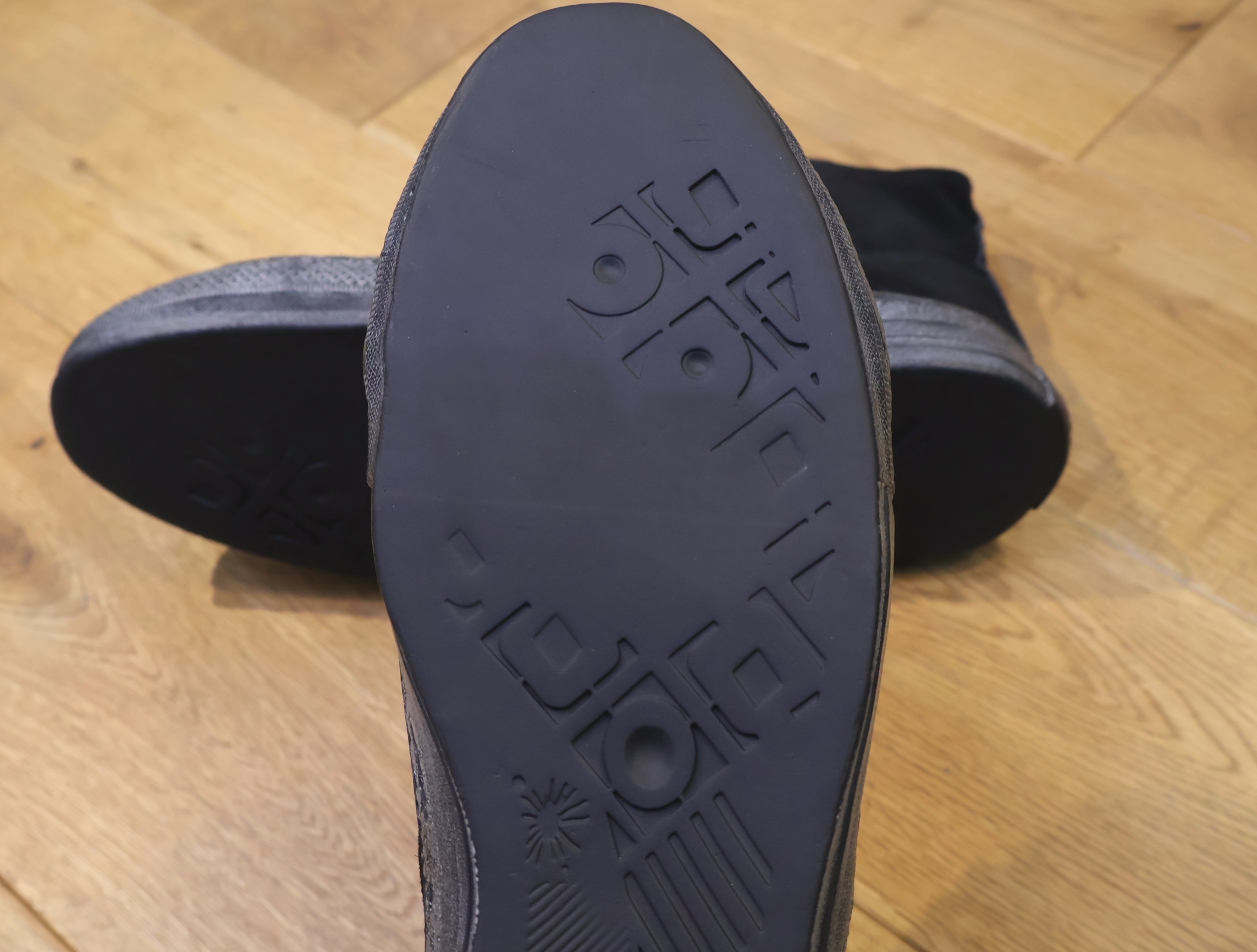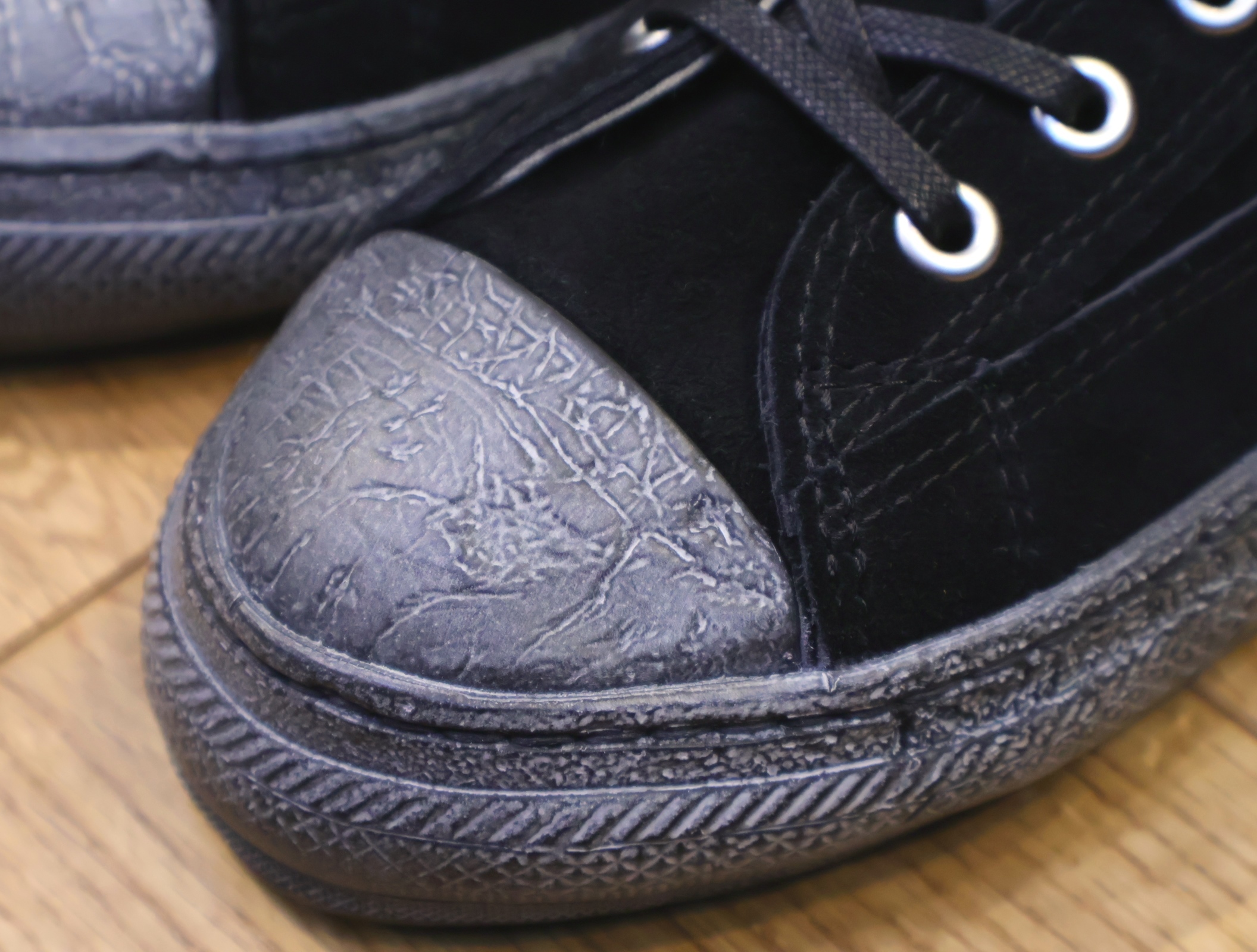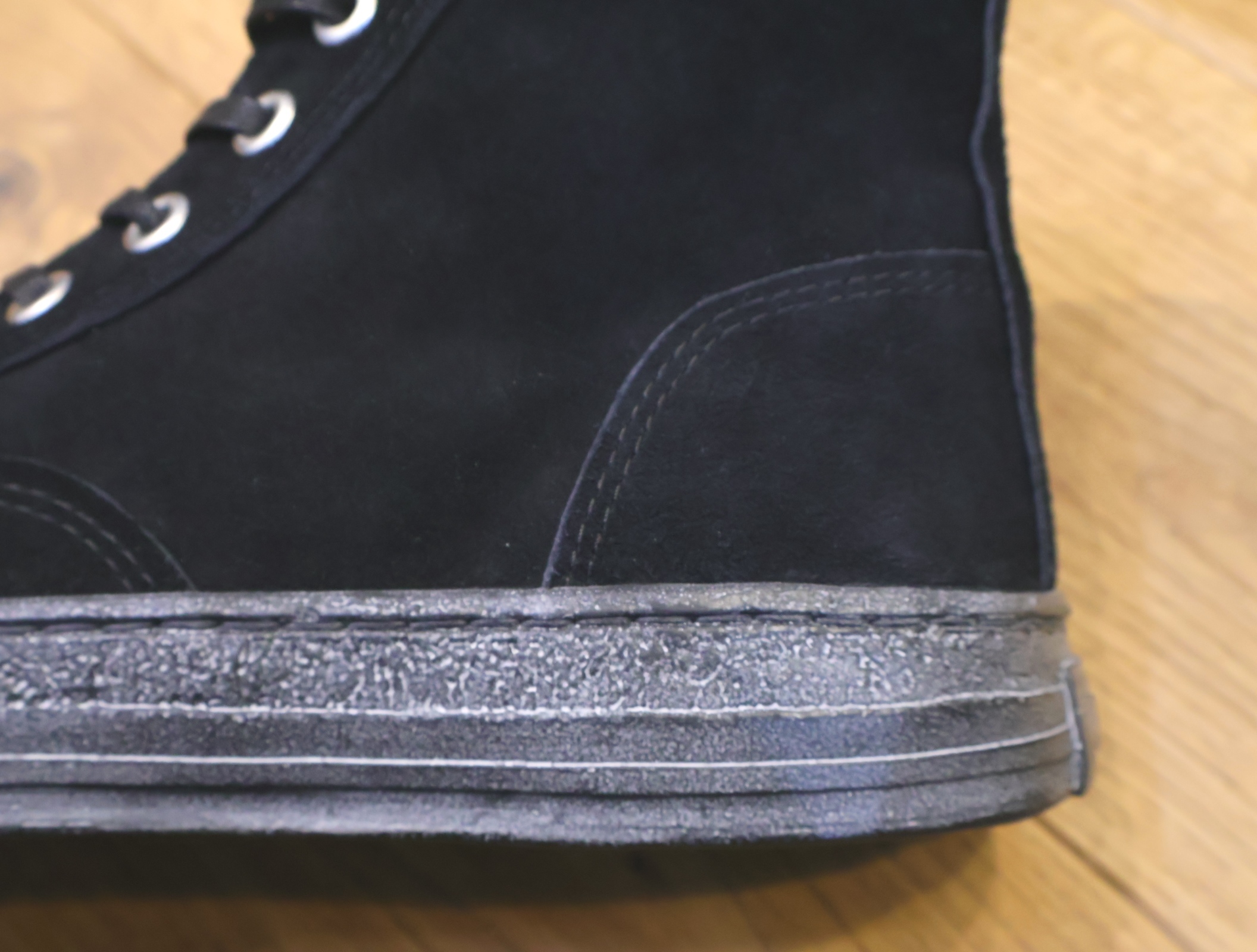 ユーズド加工が施されたトゥキャップ、アウトソールがアッパーと好相性を成すデザインです。