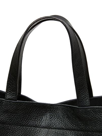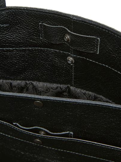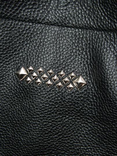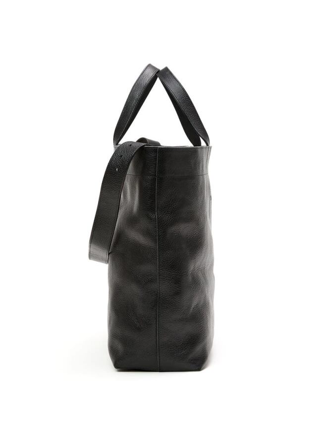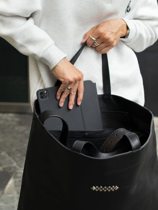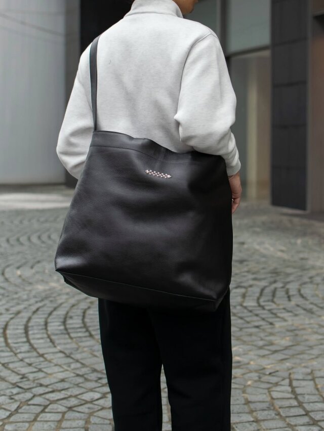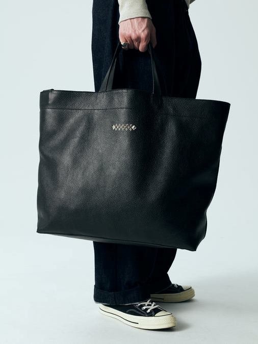 シボ感あるレザー、スタッズ等で作製されたトートバッグ。