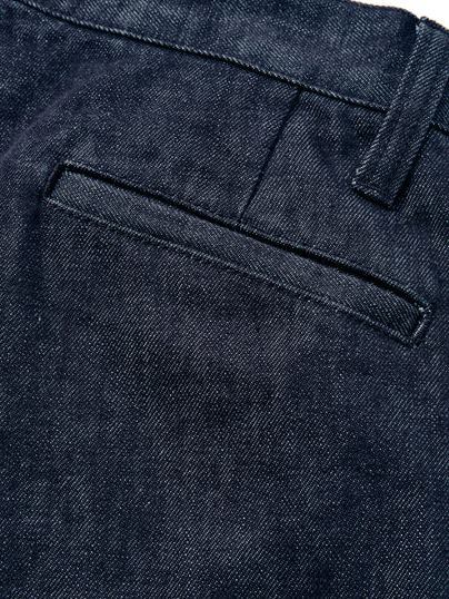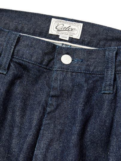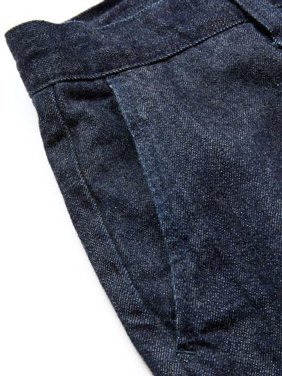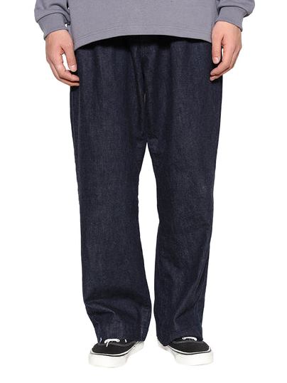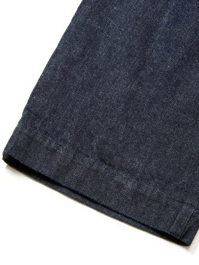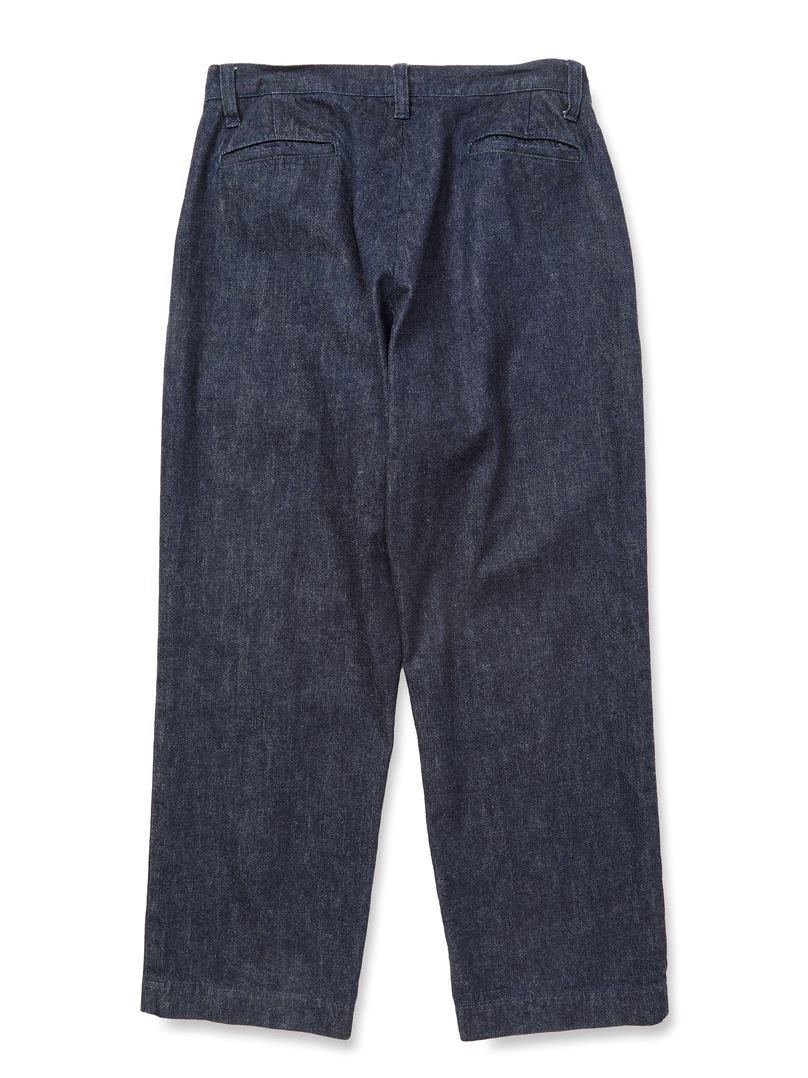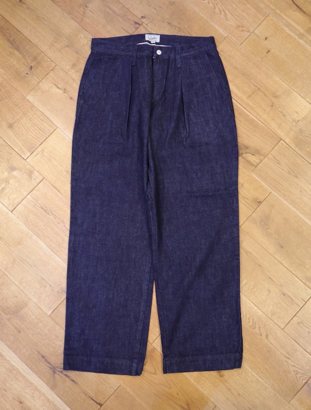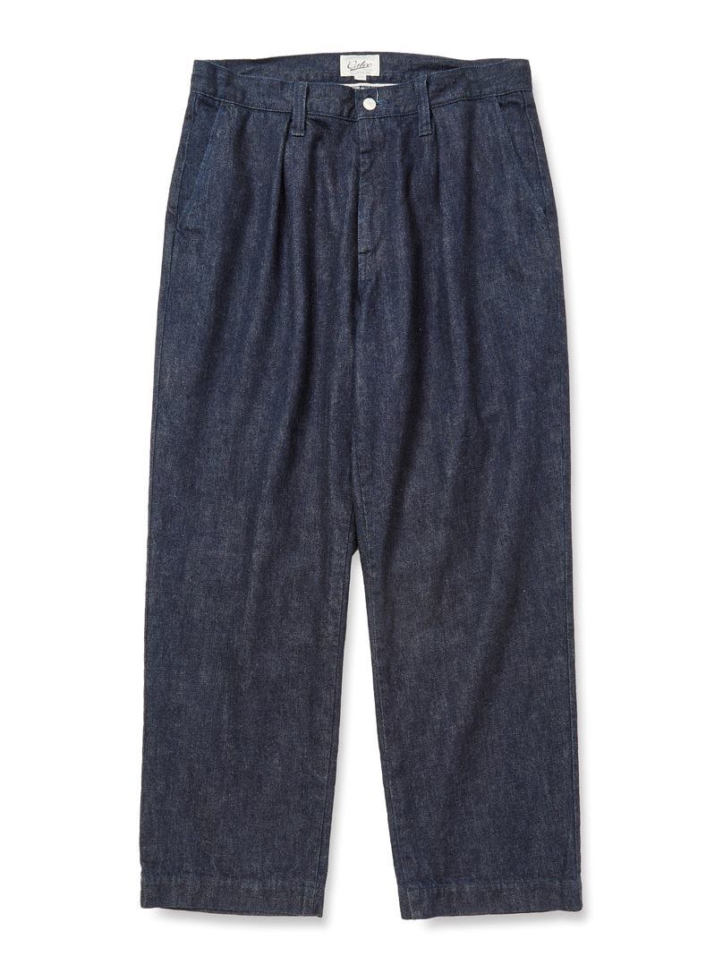 単一米綿を使用し作製されたデニムタックトラウザーズ。