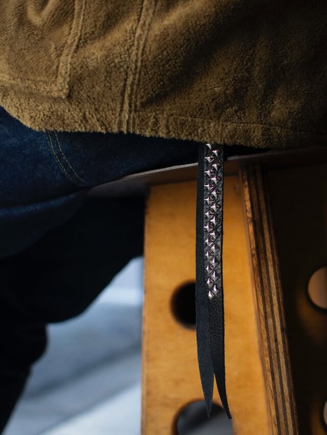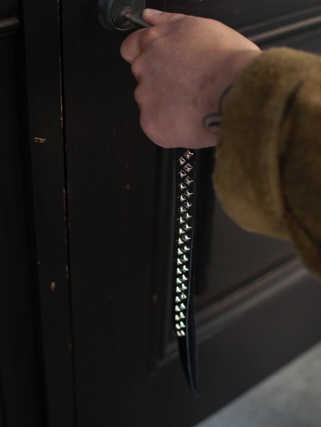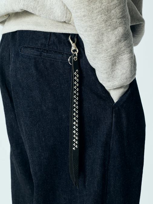 スタッズ、レザーを使用し作製されたキーリングのロングタイプです。