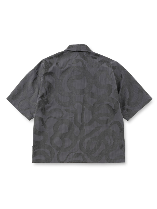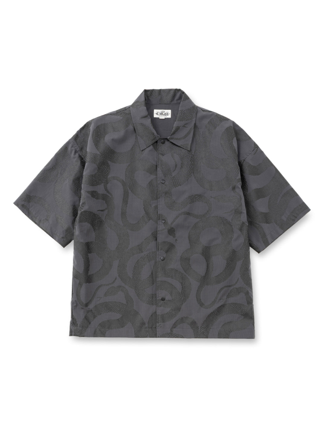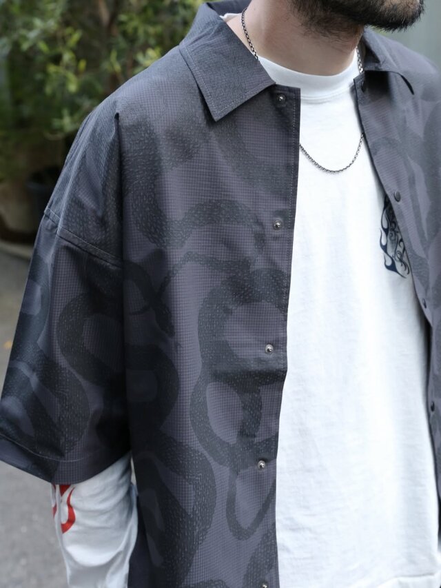 手捺染でスネーク柄を全面にプリントしたデザイン。
