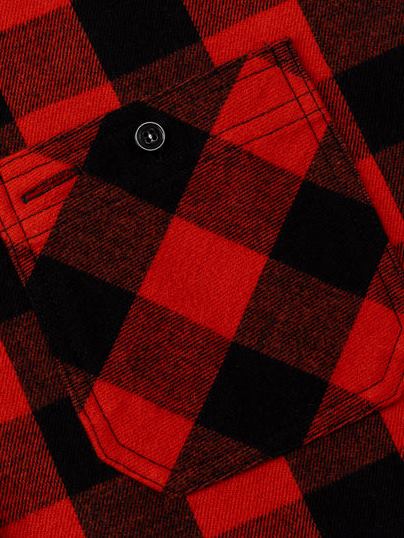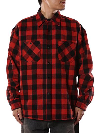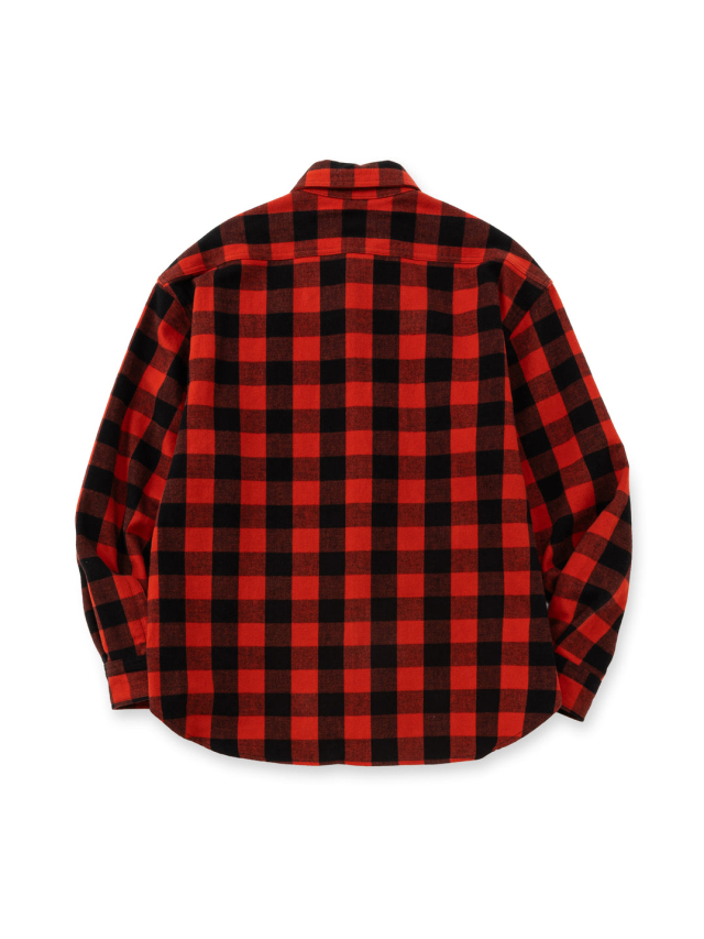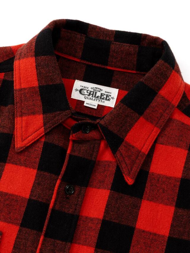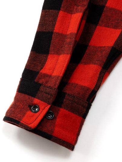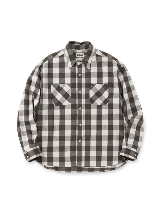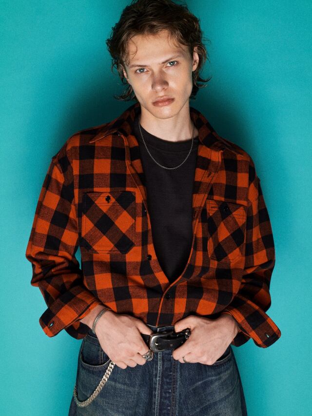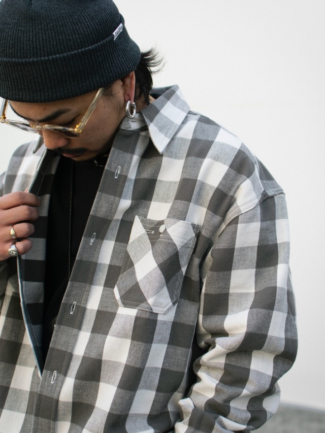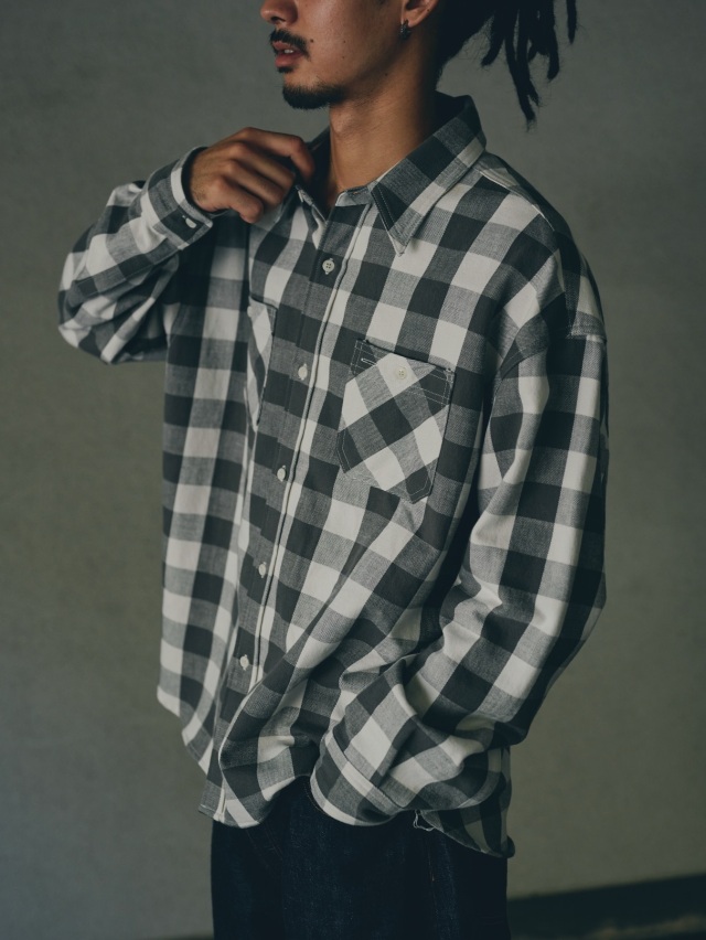 オリジナルで作製された生地を使用したブロックチェックシャツ。