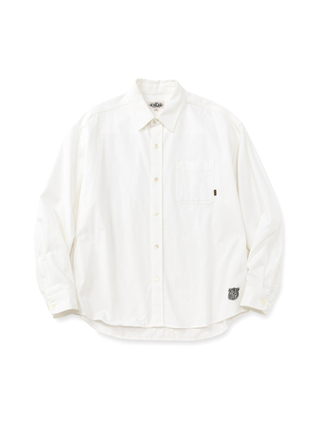 台襟、ラウンド裾仕様のドロップショルダーワイドシルエット。