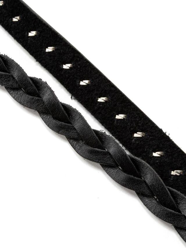 表のレザーにピラミッドスタッズを打ち込み、裏のレザーは編み込んだデザインで、肩の当たる部分には型押しでブランドロゴが入る。