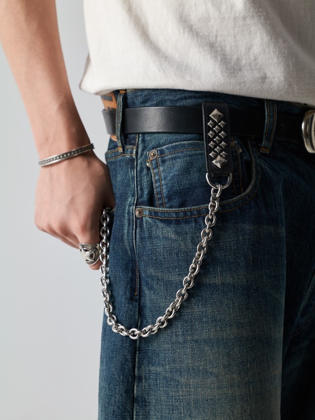 チェーン、スタッズともにシルバーメッキ加工を施した真鍮製を使用し腰回りに重厚感を演出してくれます。