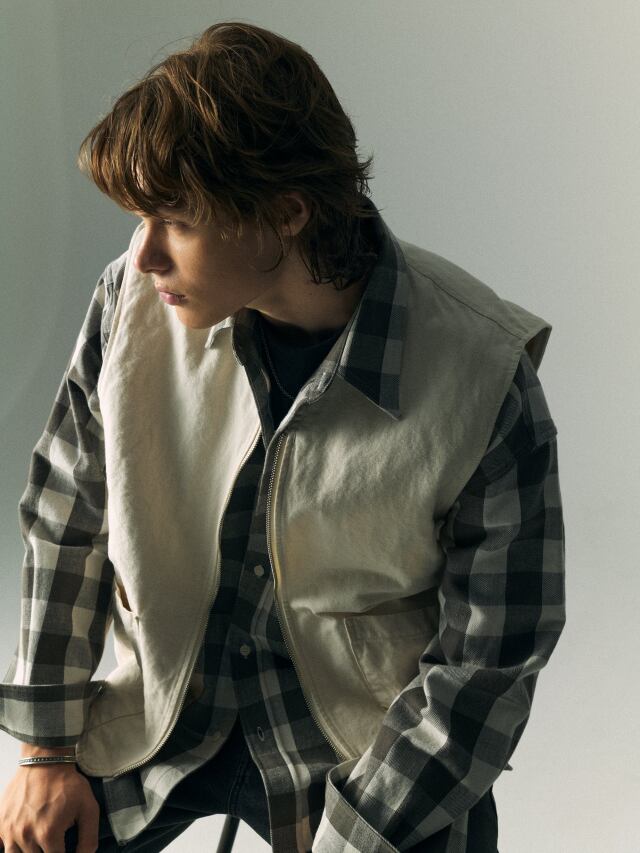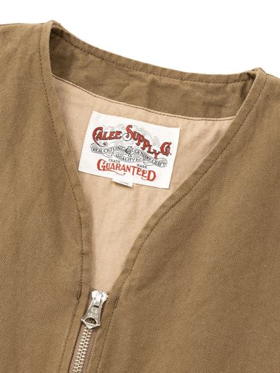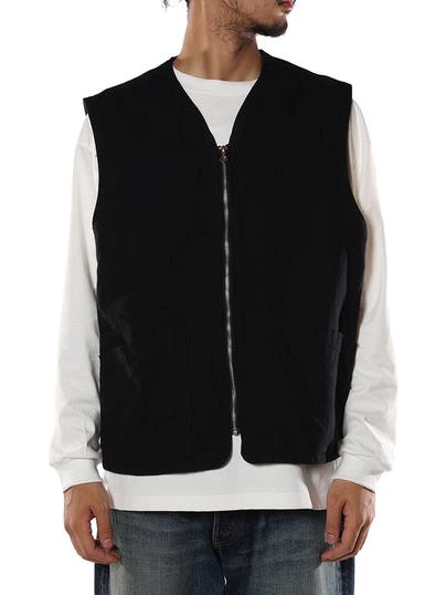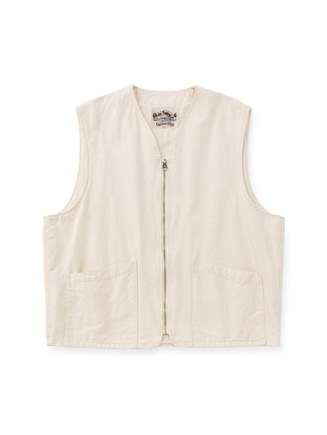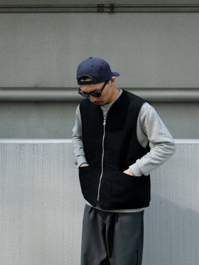 先染めのオックスフォード生地を使用し作製されたジップアップベスト。
