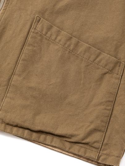 左右に大きめのポケットをつけ、Vネックノーカラー仕様にしたシンプルなデザイン。