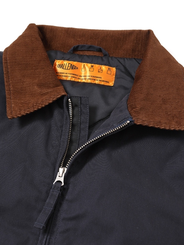襟部分をコーデュロイで切り替え、左裾部分にブランドタグを叩きつけたワークテイストなデザインとなっています。