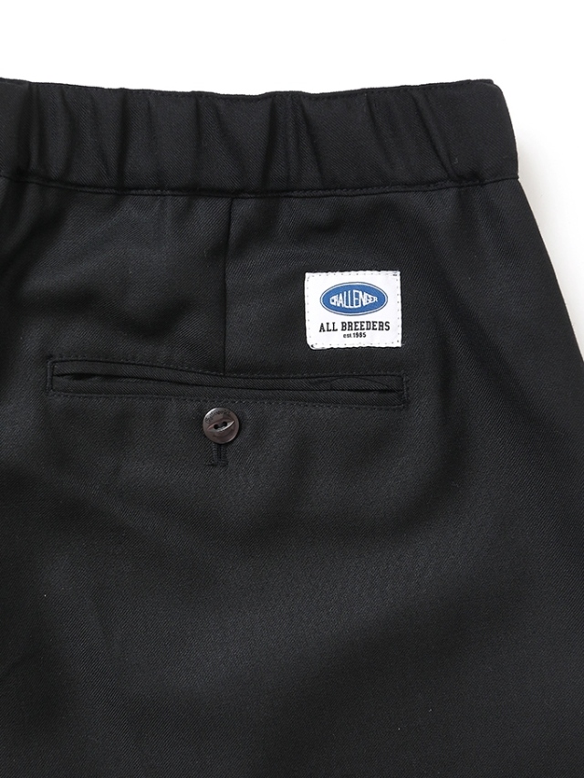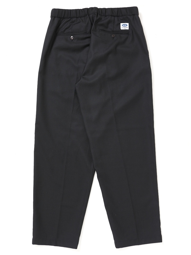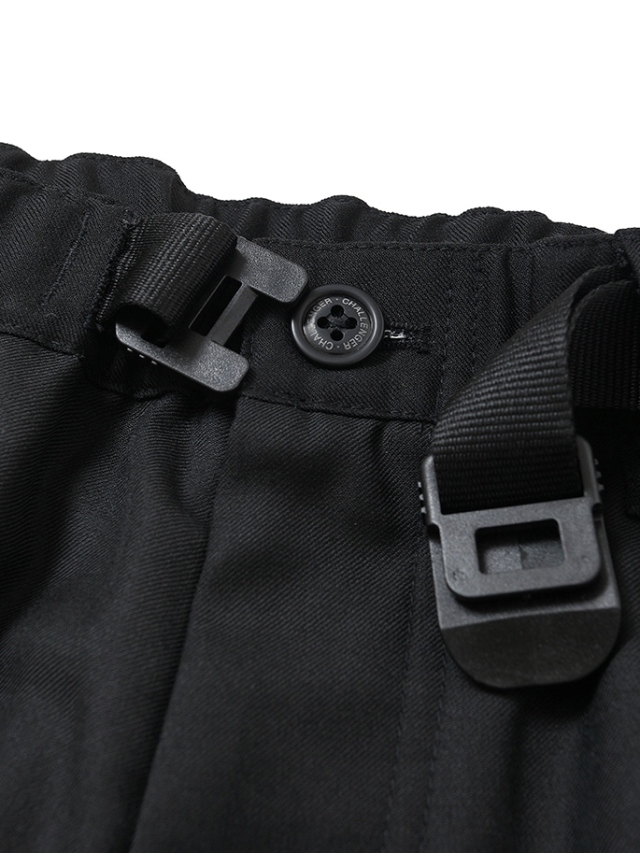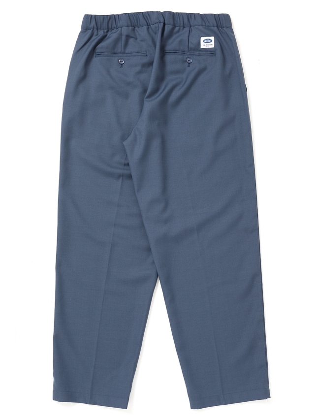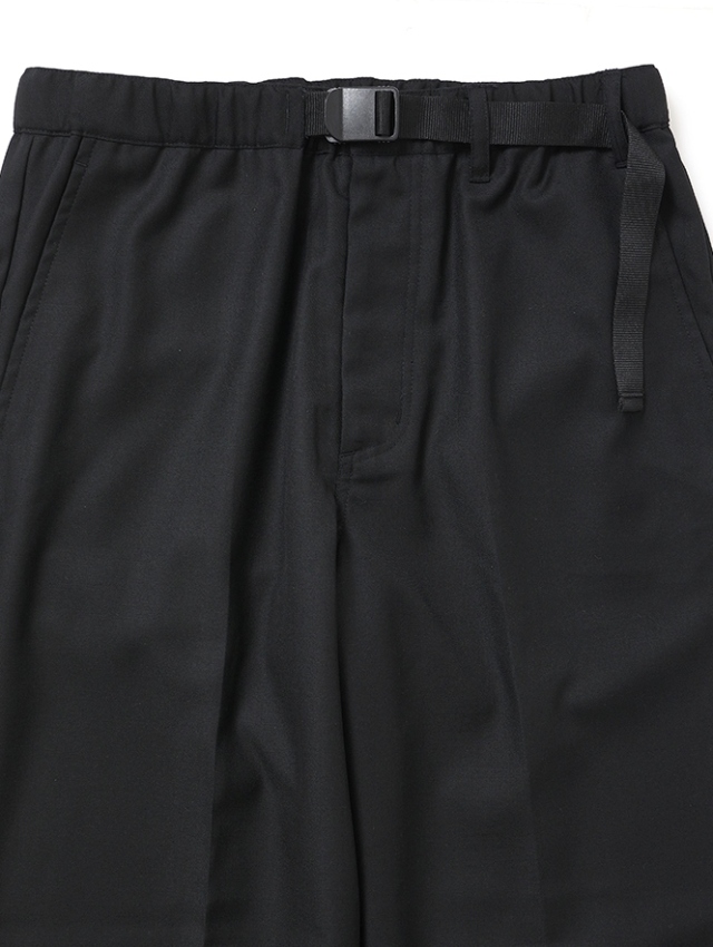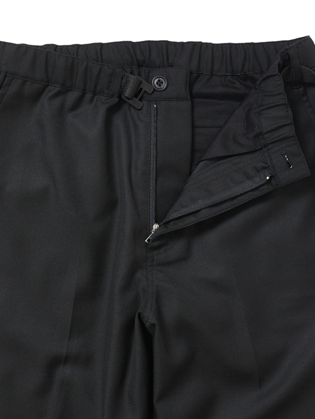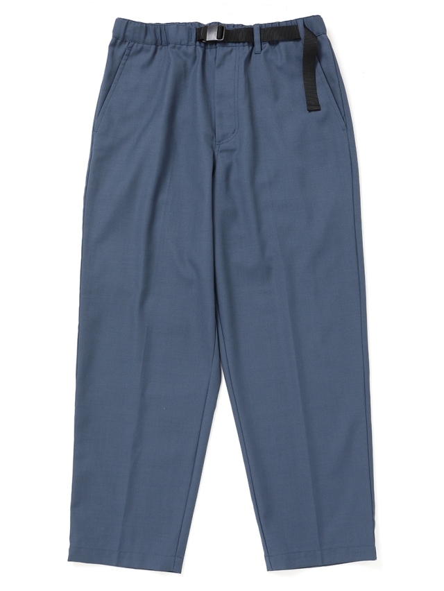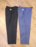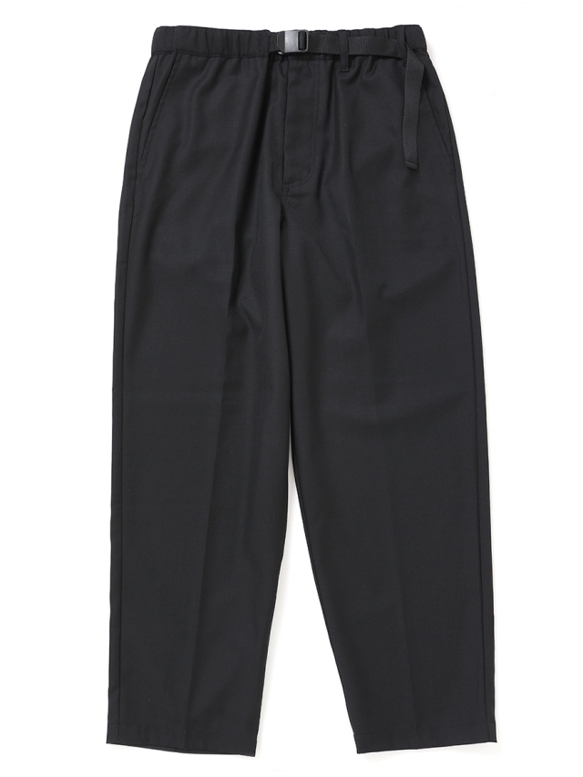 ウエストにイージーベルトの付いた前開きあり仕様となっており、ワタリに余裕を持たせ、ややテーパードをかけたワイドシルエット。