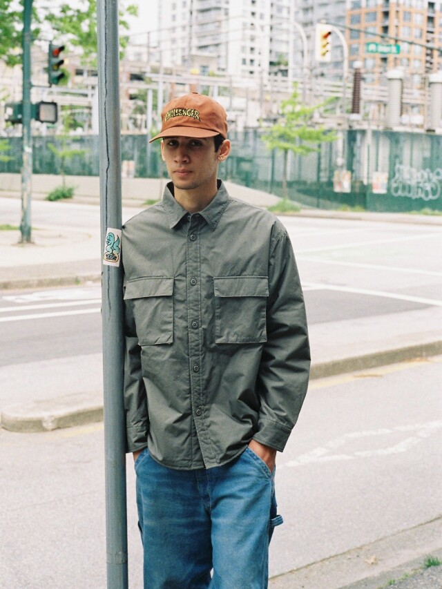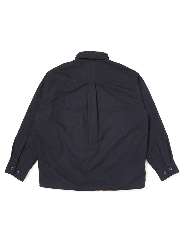 フロント両胸にはマチ付きの大ぶりのポケットをつけ、ピスネームを挟み込んだシンプルなデザイン。