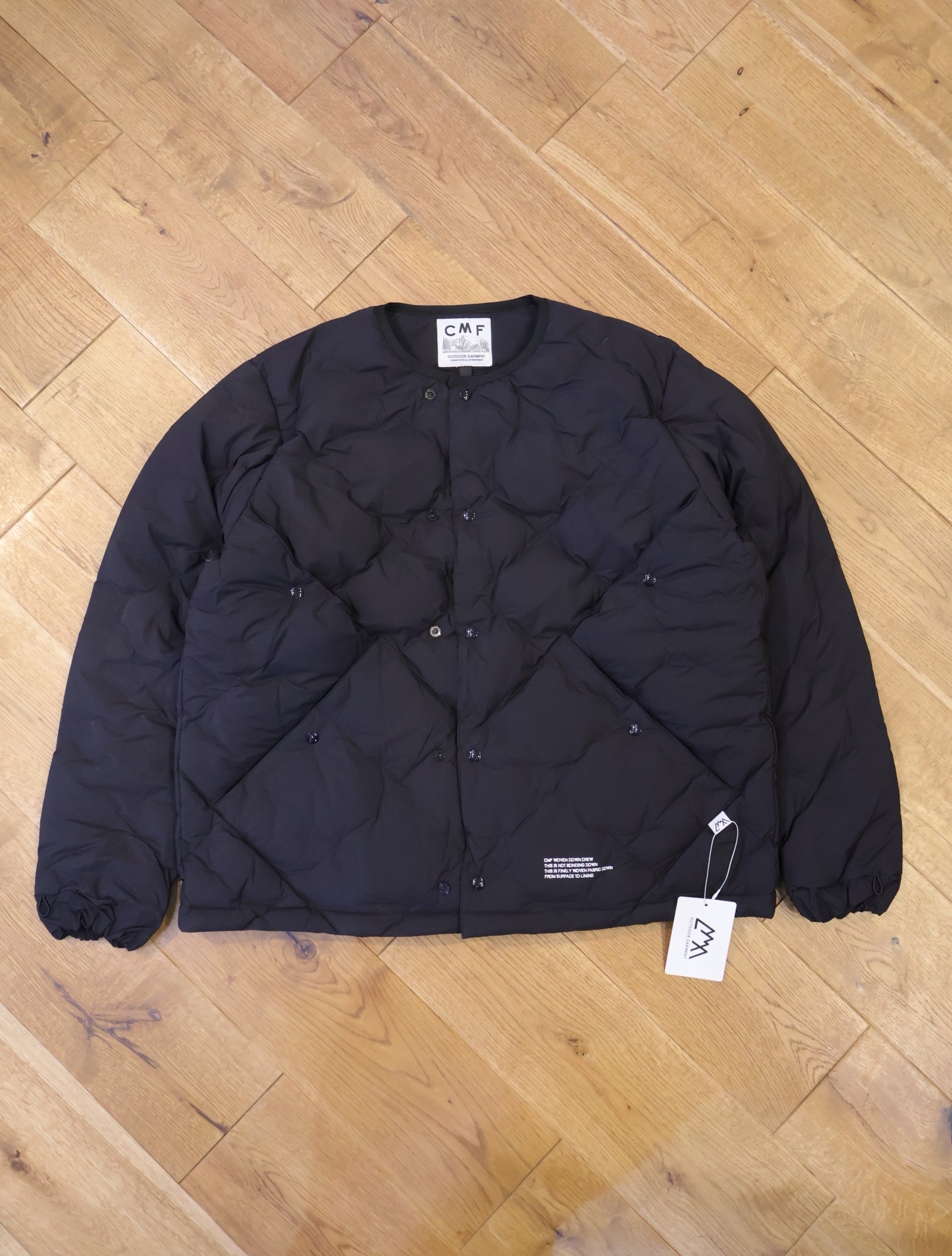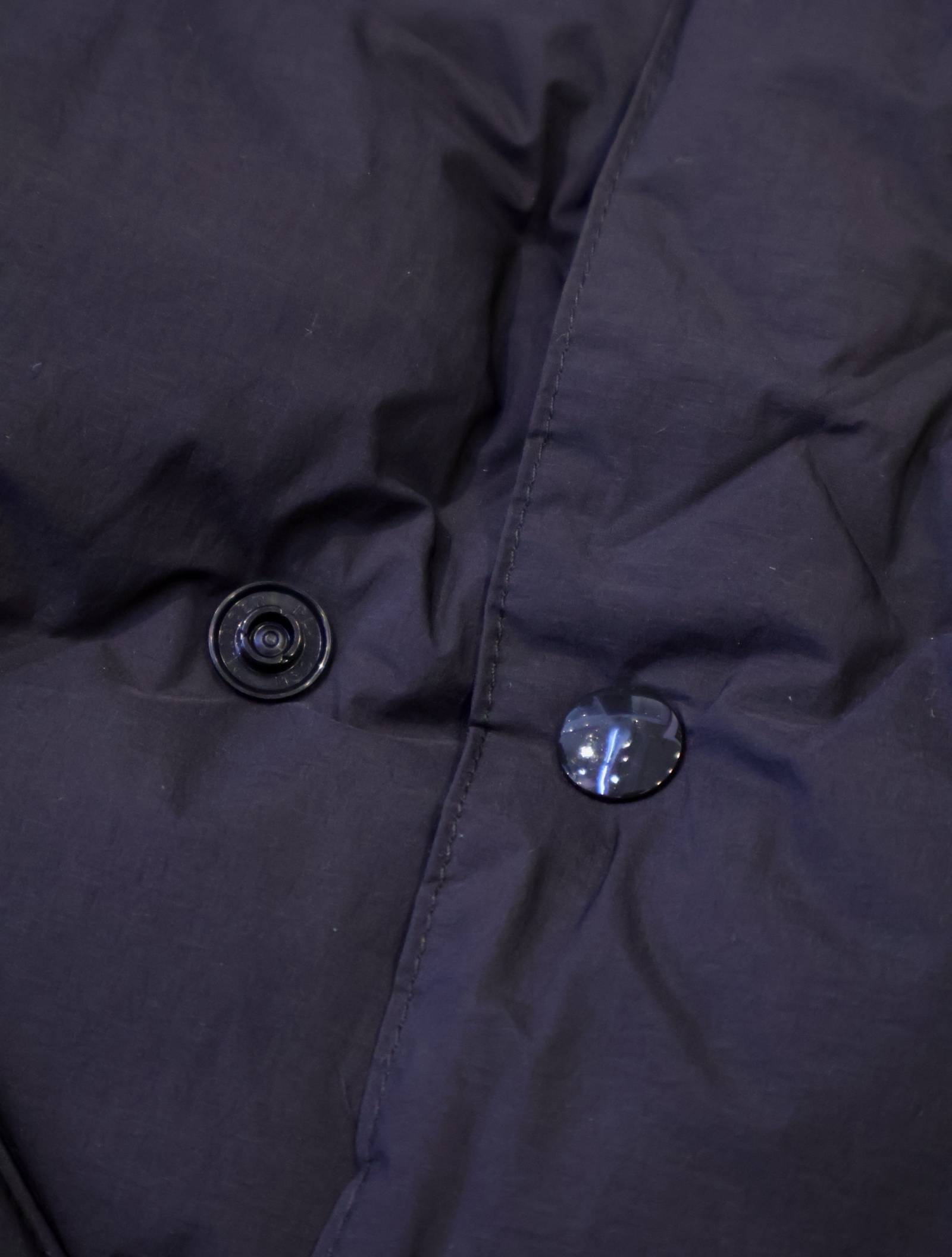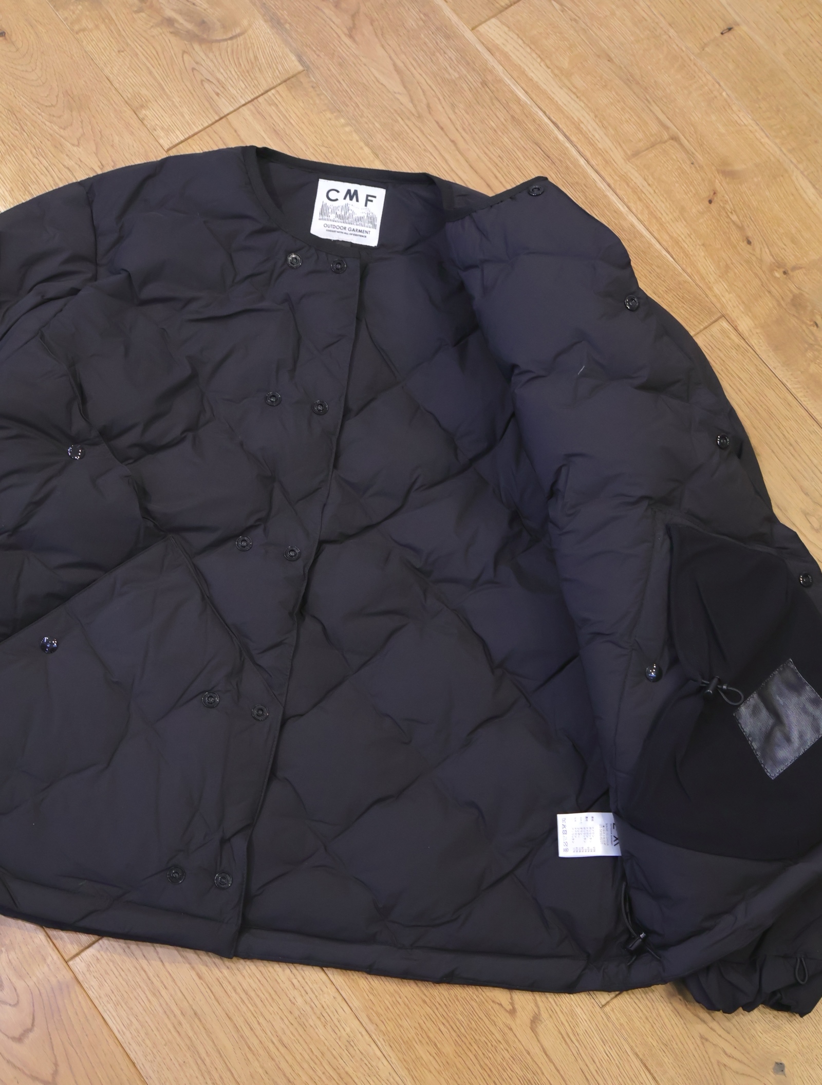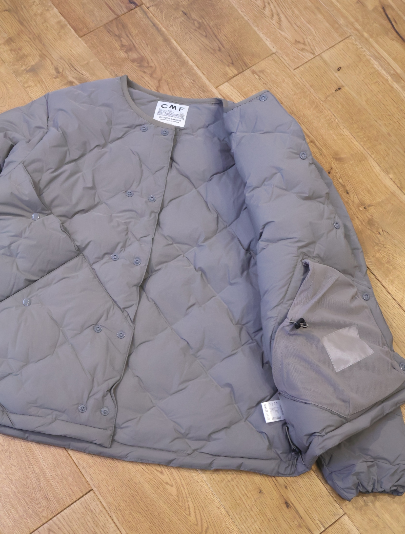 中綿には700FPを90:10の比率でダウンを封入し、脇ポケット+その上の脇ポケットを配置した特徴的なデザインに仕上がっています。 フロントはスナップボタンでの開閉となっており、留める位置によって着用時のシルエット、身幅の調節が可能です。