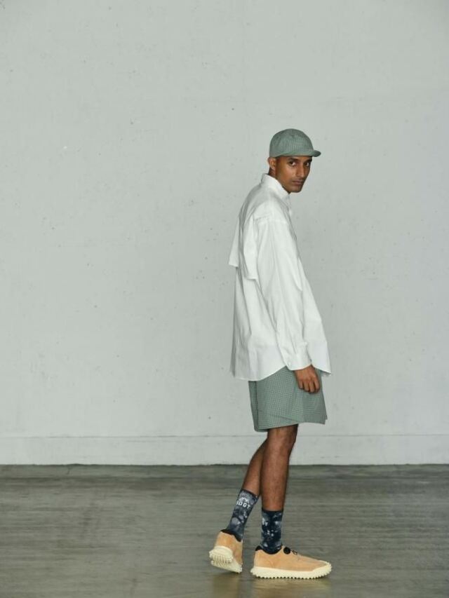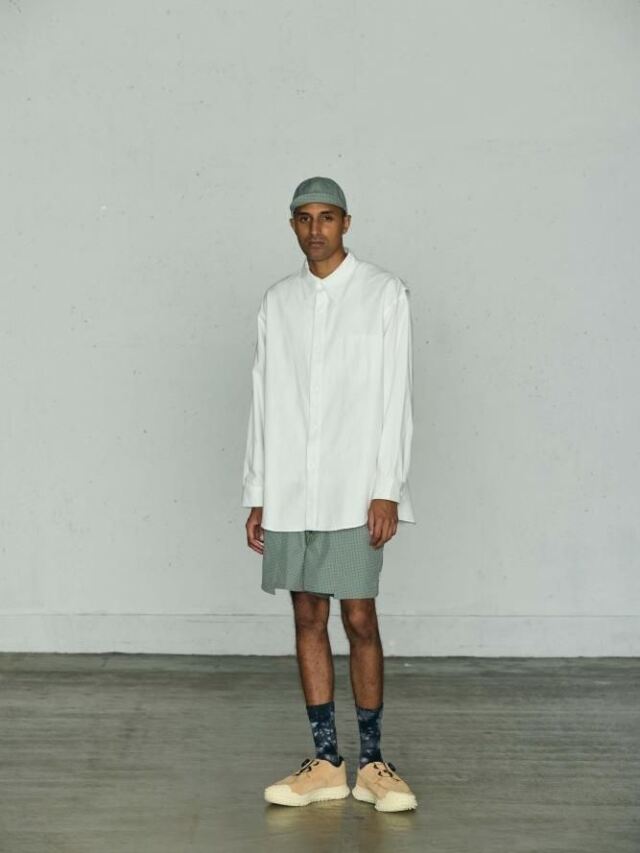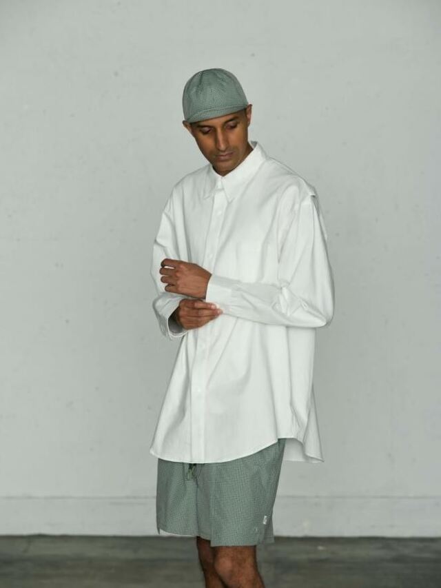 コットンオックス生地を使用し、身幅にゆとりのあるワイドシルエットで作製しています。