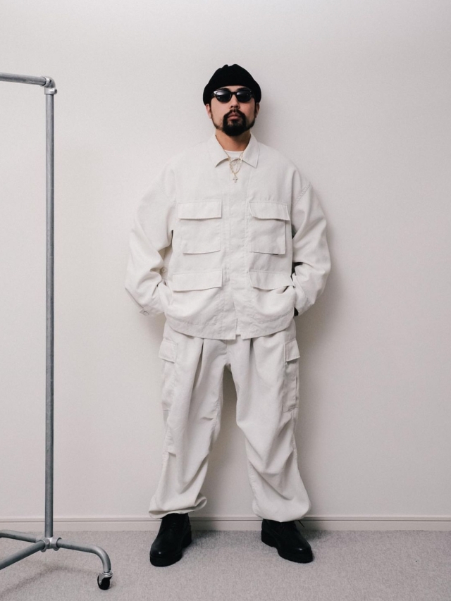 同生地を使用した、「Polyester Canvas Error Fit Cargo Easy Pants」 2タック イージーカーゴパンツとセットアップでの着用もおすすめです。