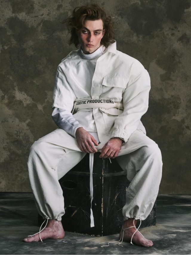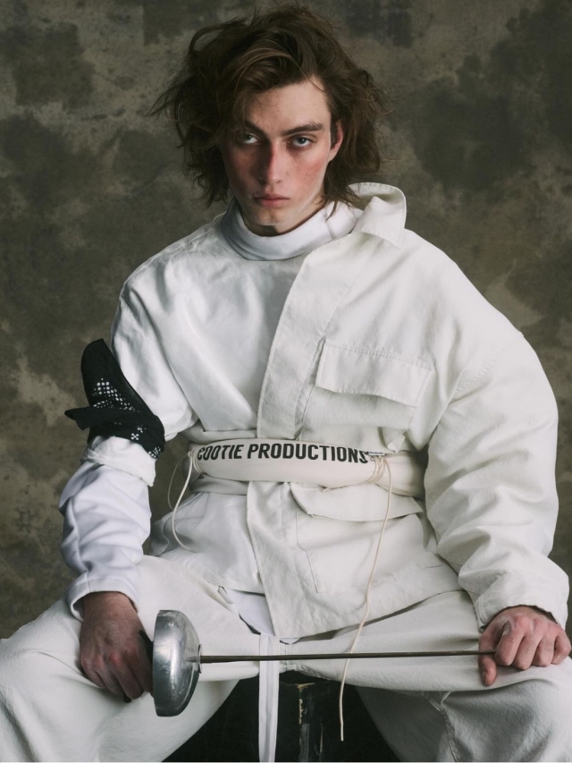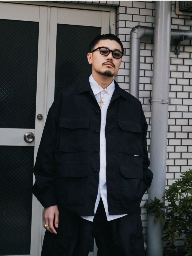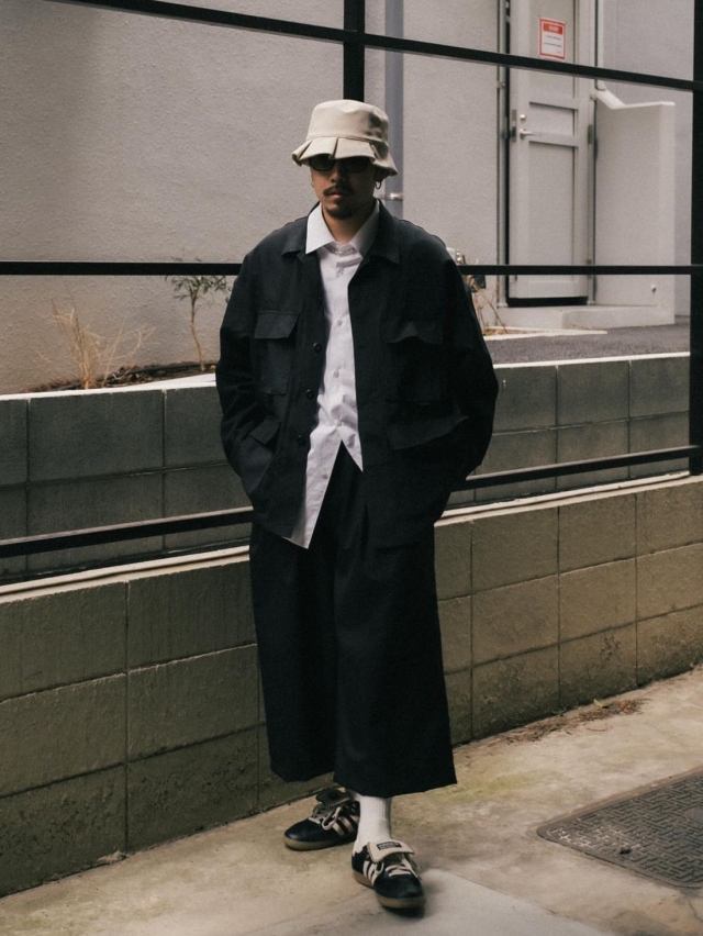 一枚仕立てで、4つのフロントフラップポケットと比翼仕立ての前立て、ゆったりとしたワイドシルエット。