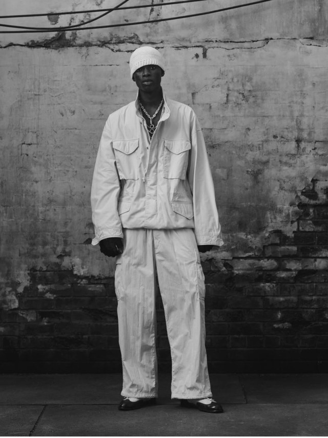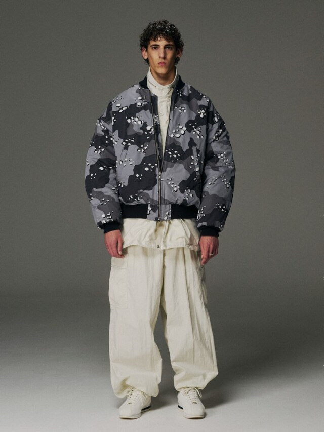 裾にはドローコードが付く、ワイドシルエットで作製されています。
