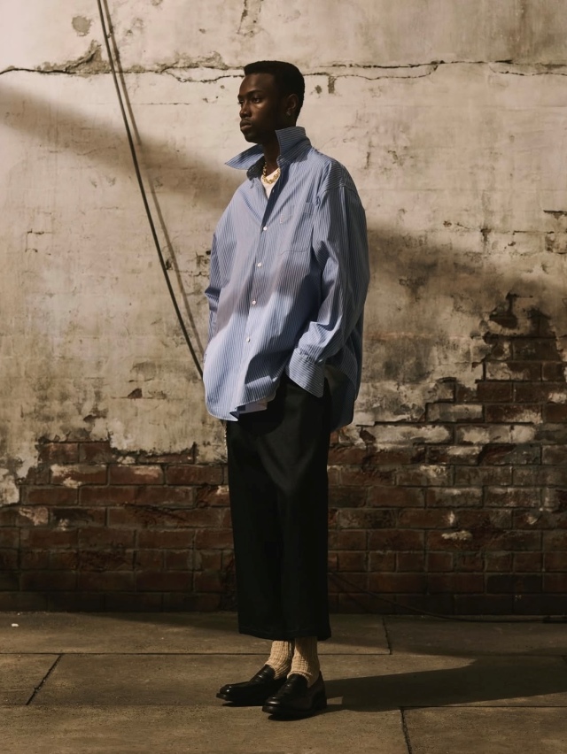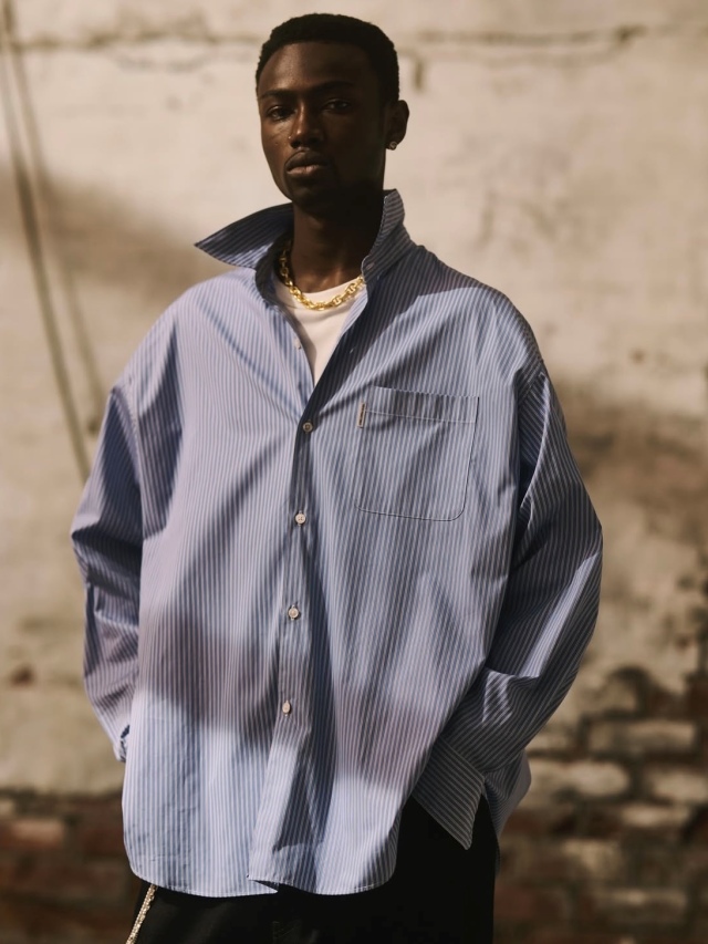 スビンコットンとギザコットンの混紡糸で織り上げられたオリジナルストライプブロード生地を使用したStripe Broad Oversized L/S Shirtです。