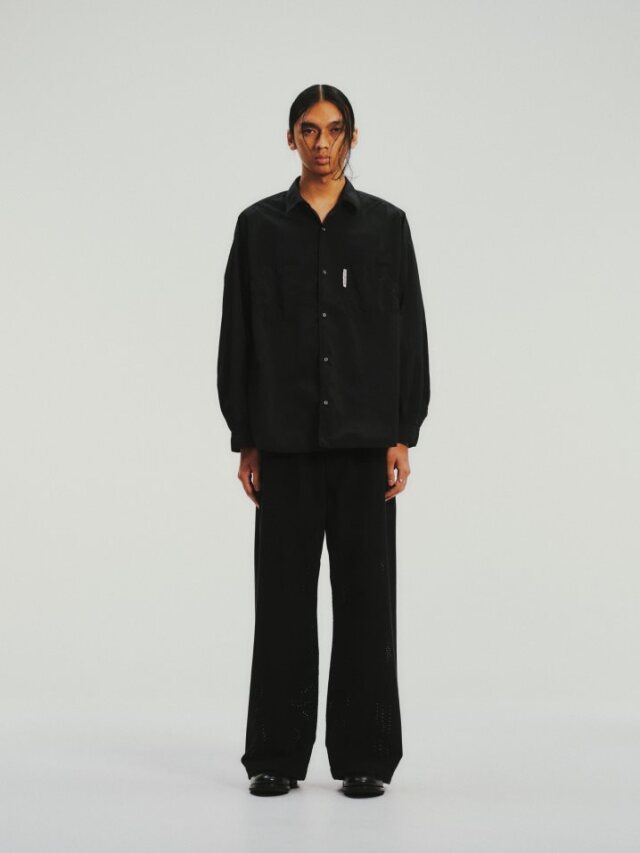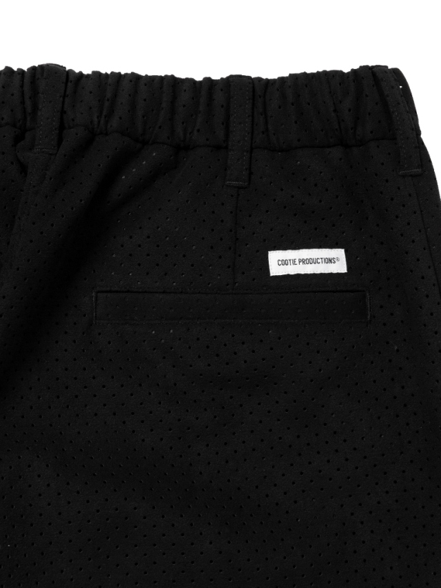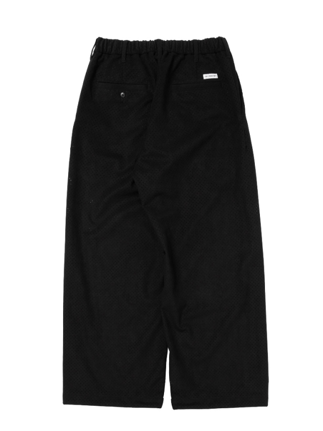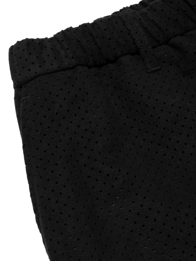 マイクロファイバーならではの滑らかで柔らかい質感を持つビーガンスエードに対し、パンチング加工を施したオリジナルファブリックを使用したPunching Faux Suede Side Seamless Easy Trousersです。