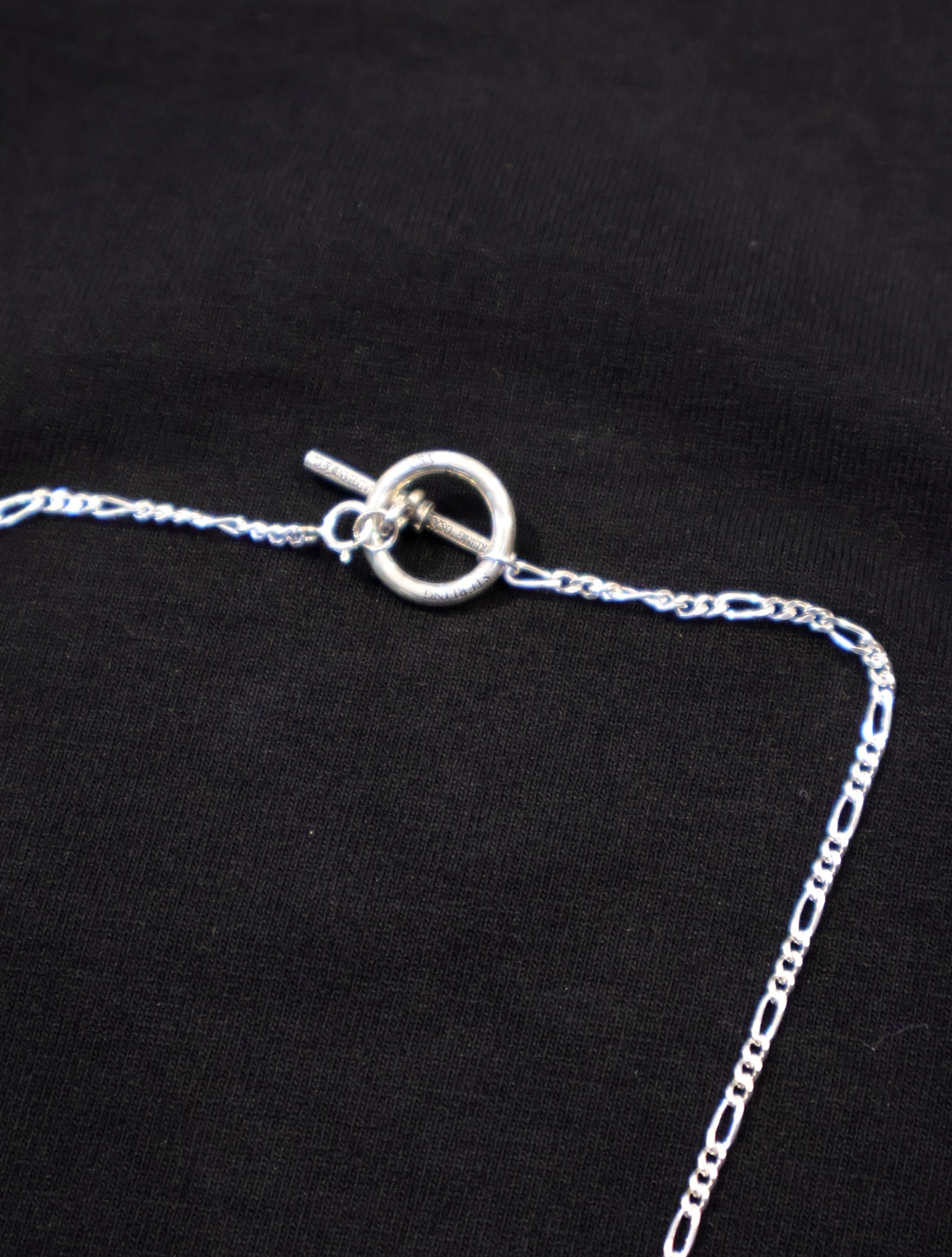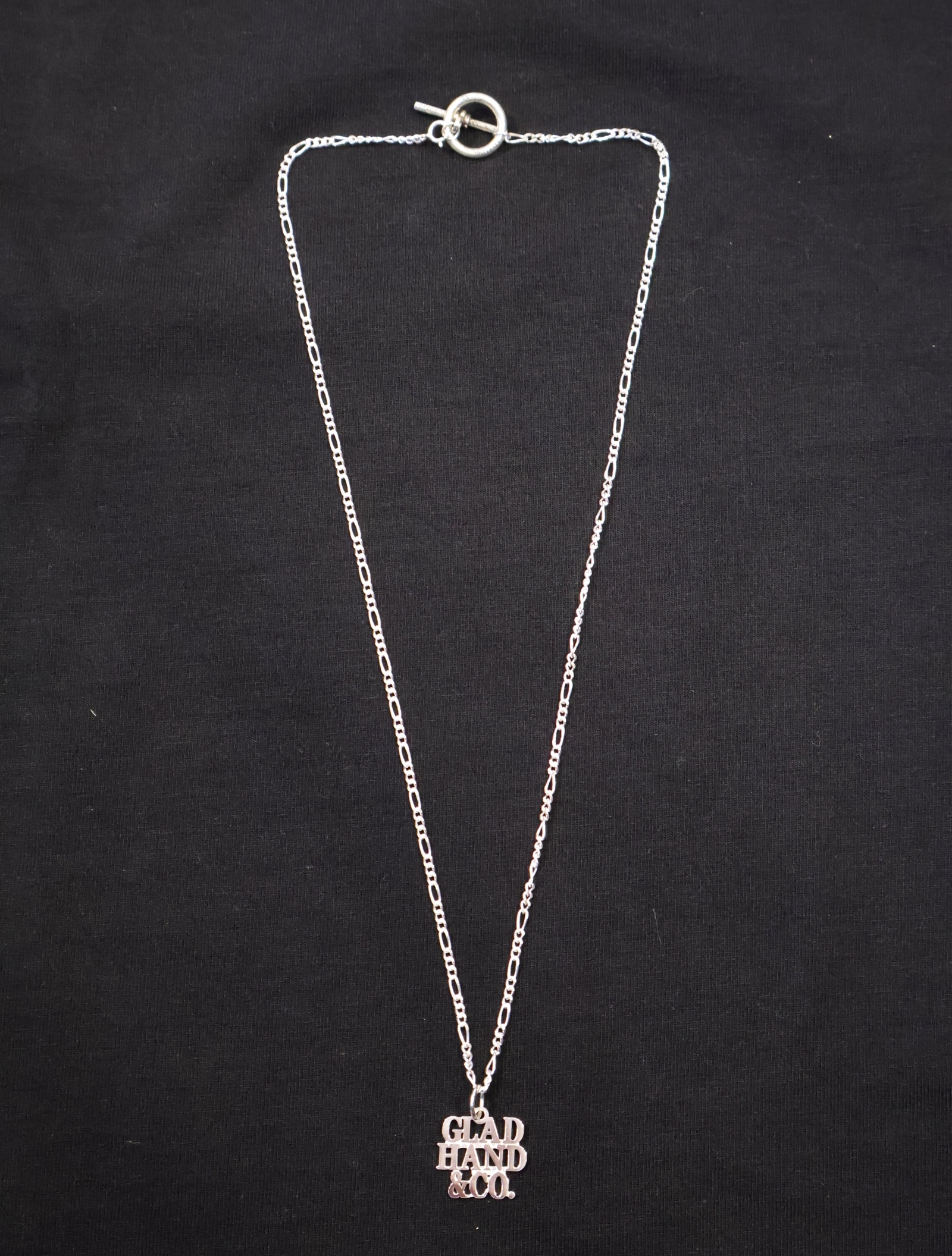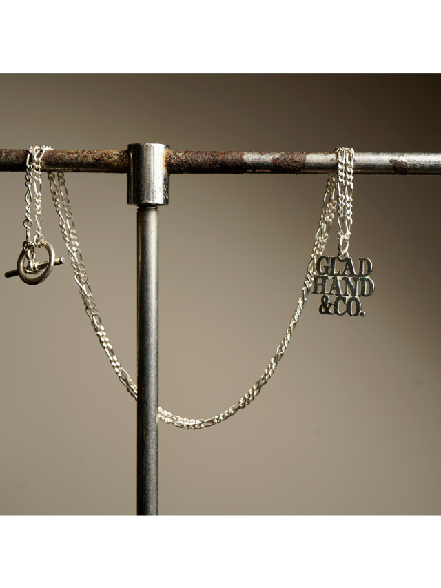 「GLAD HAND & Co」のネックレストップ、フィガロタイプのネックレスチェーン、ネックレスの留め、エンドパーツはオリジナルののTバーデザインで作製されています。