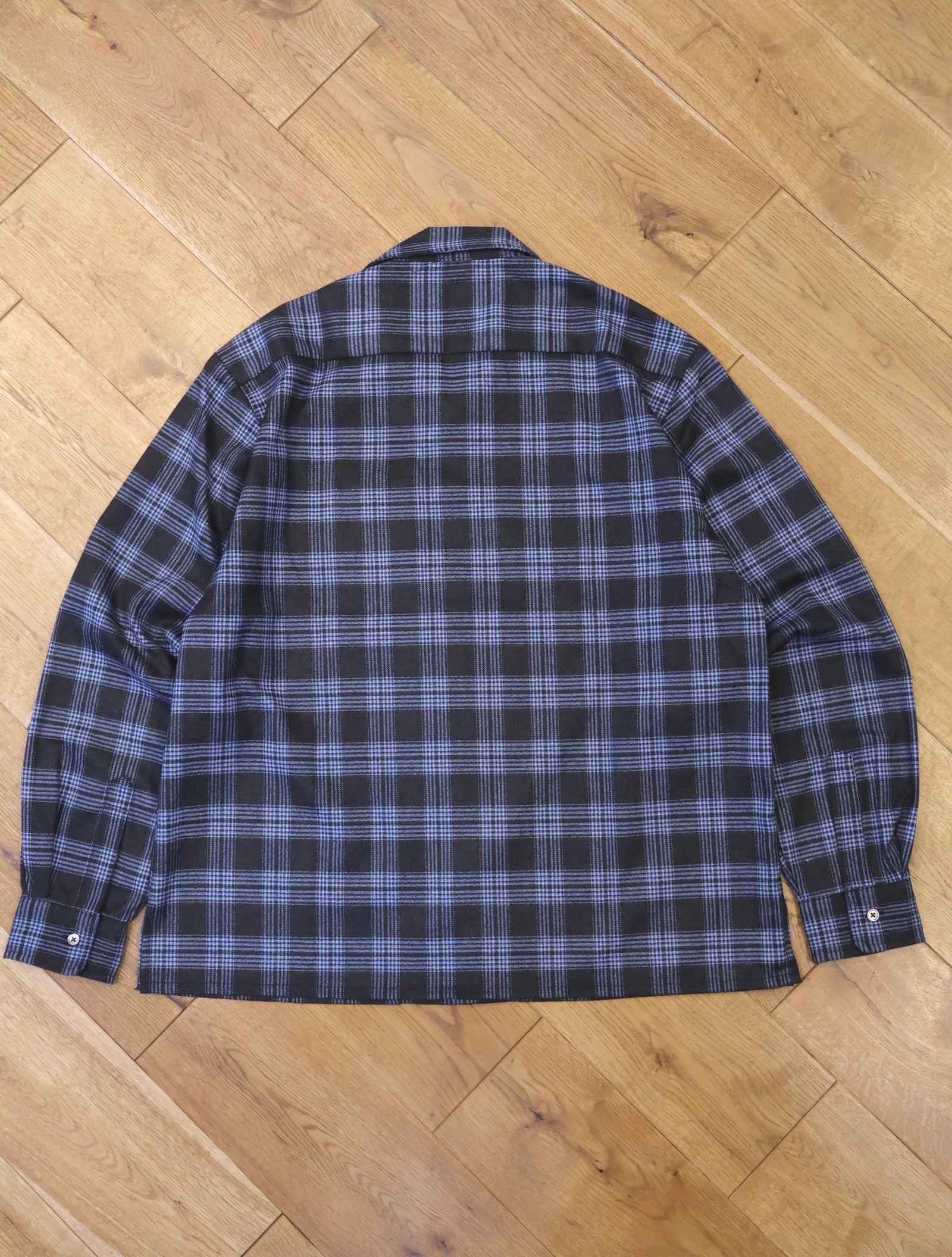 ポリエステル・ウール混紡のオリジナルのオンブレチェック生地で作製されたオープンカラーシャツです 。