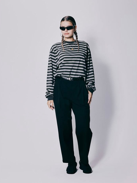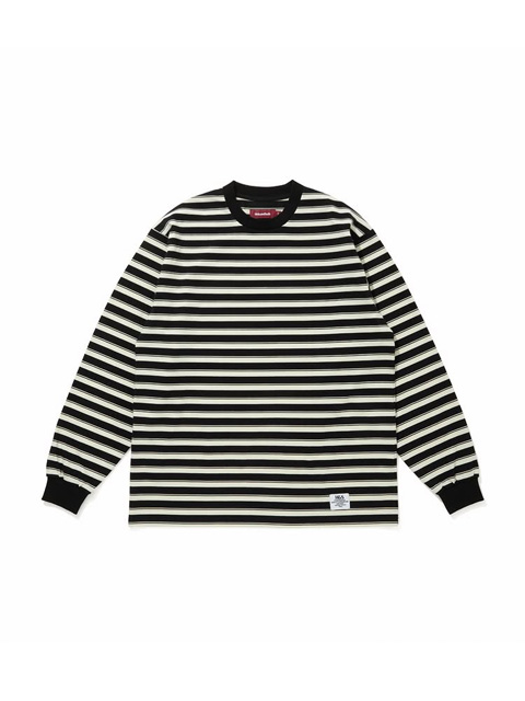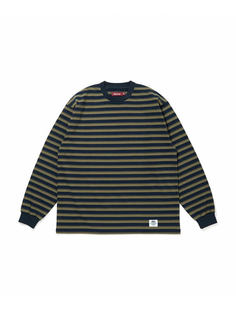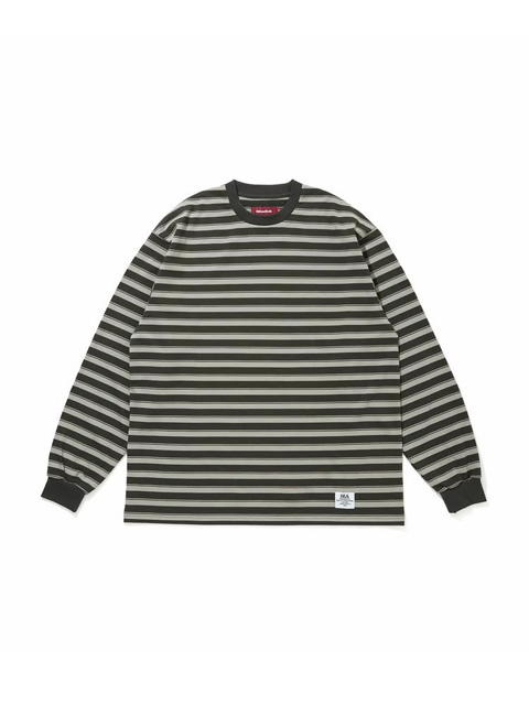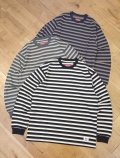 オリジナルパターンのボーダーが印象的なアイテムで、袖部分はリブ仕様、フロント左裾にネームタグが付きデザインのアクセントに。