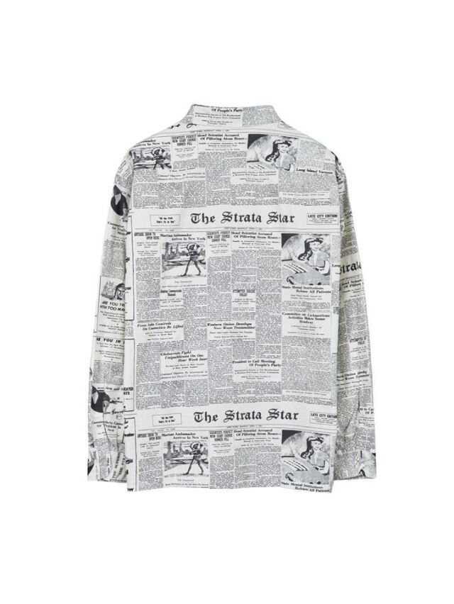 ニュースペーパー柄をコラージュしたグラフィックを全面プリントで表現したオリジナル生地を使用したオープンカラーシャツです。