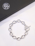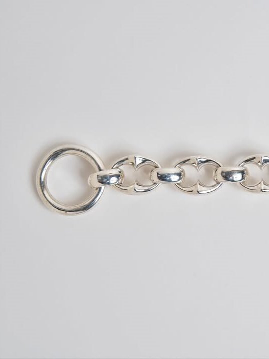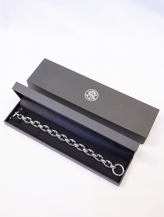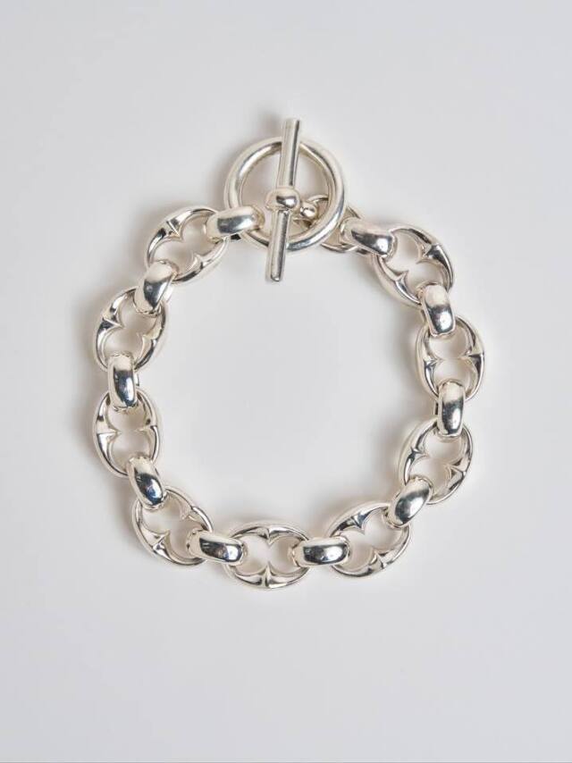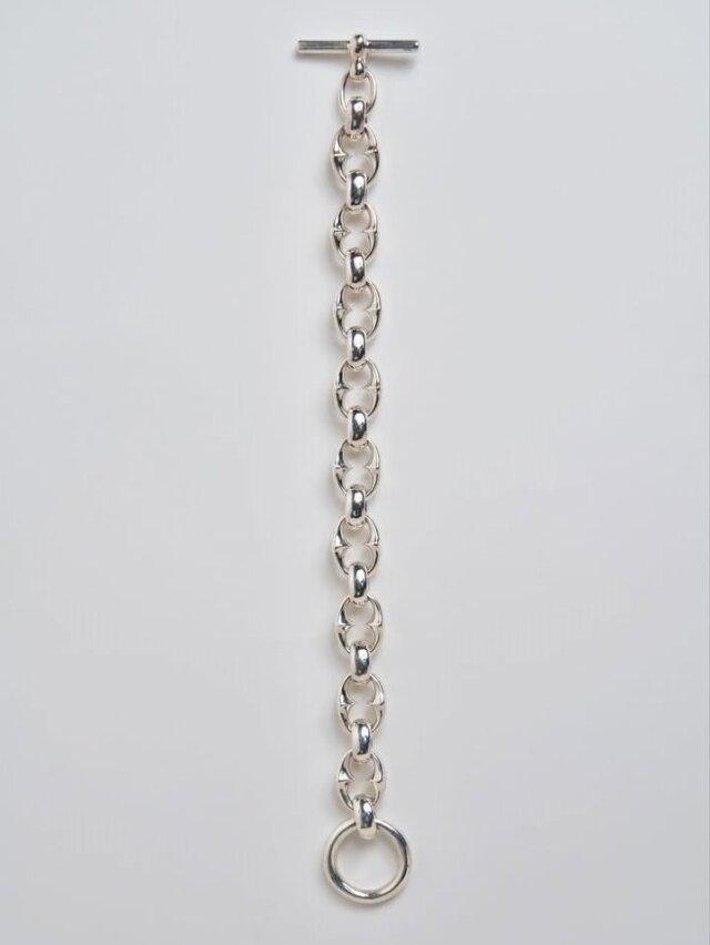 オリジナルで作成したオーバル型のコマをリングで接続しの留め具はTバー仕様の、ハンドメイドで仕上げられた非常に手の込んだ仕様のブレスレットです。