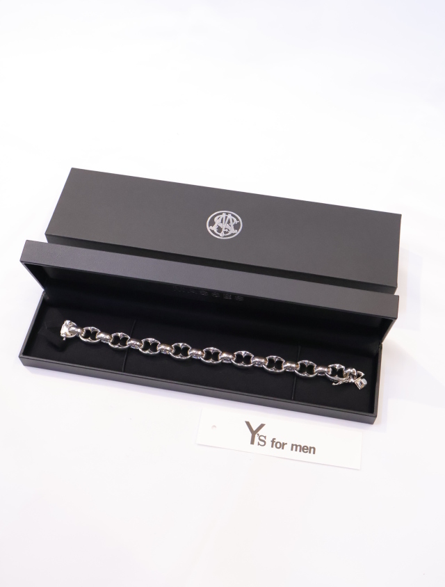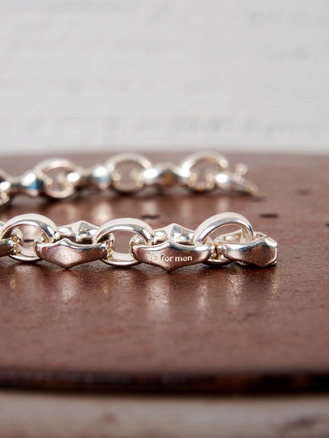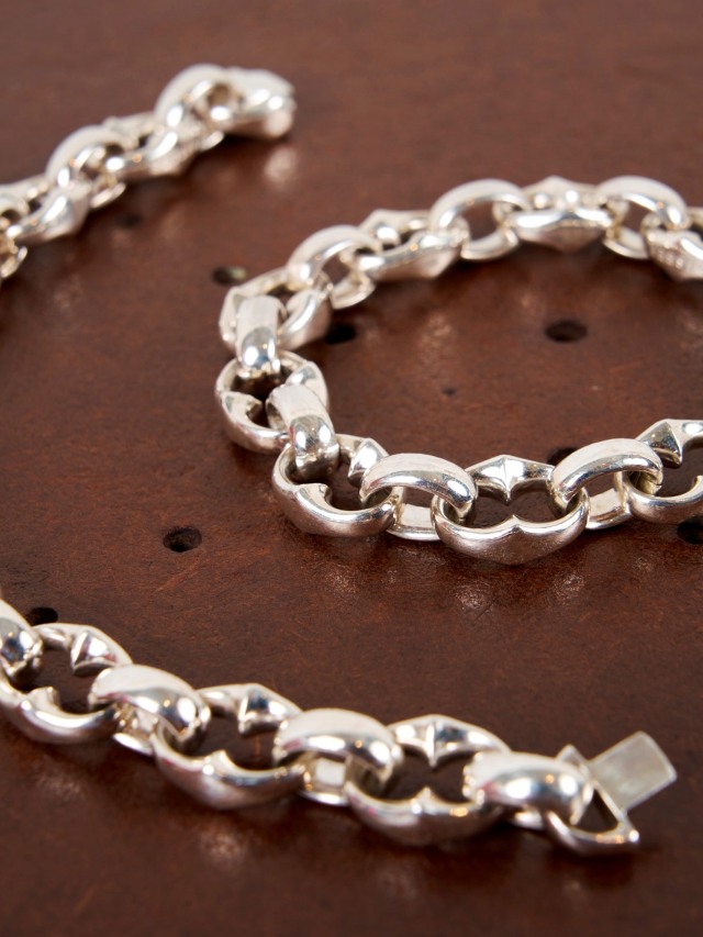 オリジナルで作成したオーバル型のコマをリングで接続した、ハンドメイドで仕上げられた非常に手の込んだ仕様のブレスレットです。
