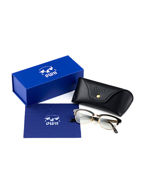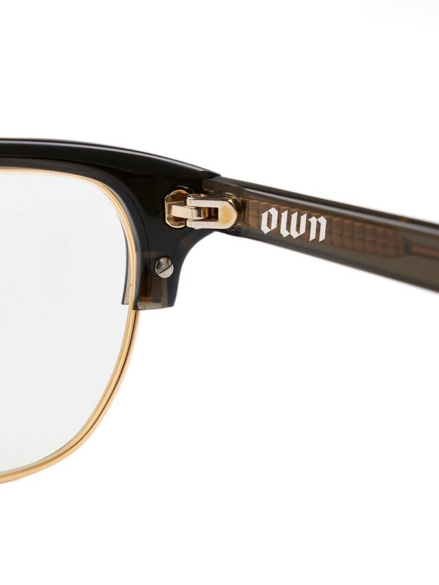 天地幅を抑えたレンズシェイプと、幅広なブリッジを組み合わせたブロウタイプ。
