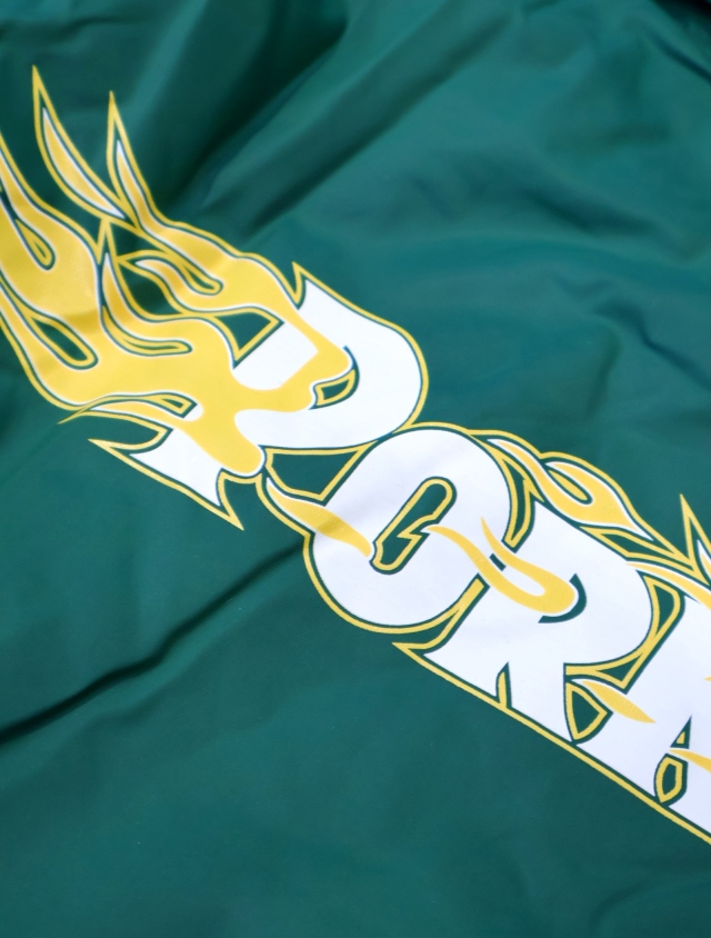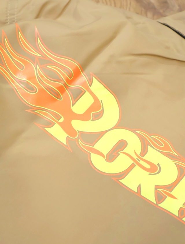 ナイロン素材のボディで製作され、フロント左胸とバックに「BURNING LOGO」のグラフィックがプリントで入ります。