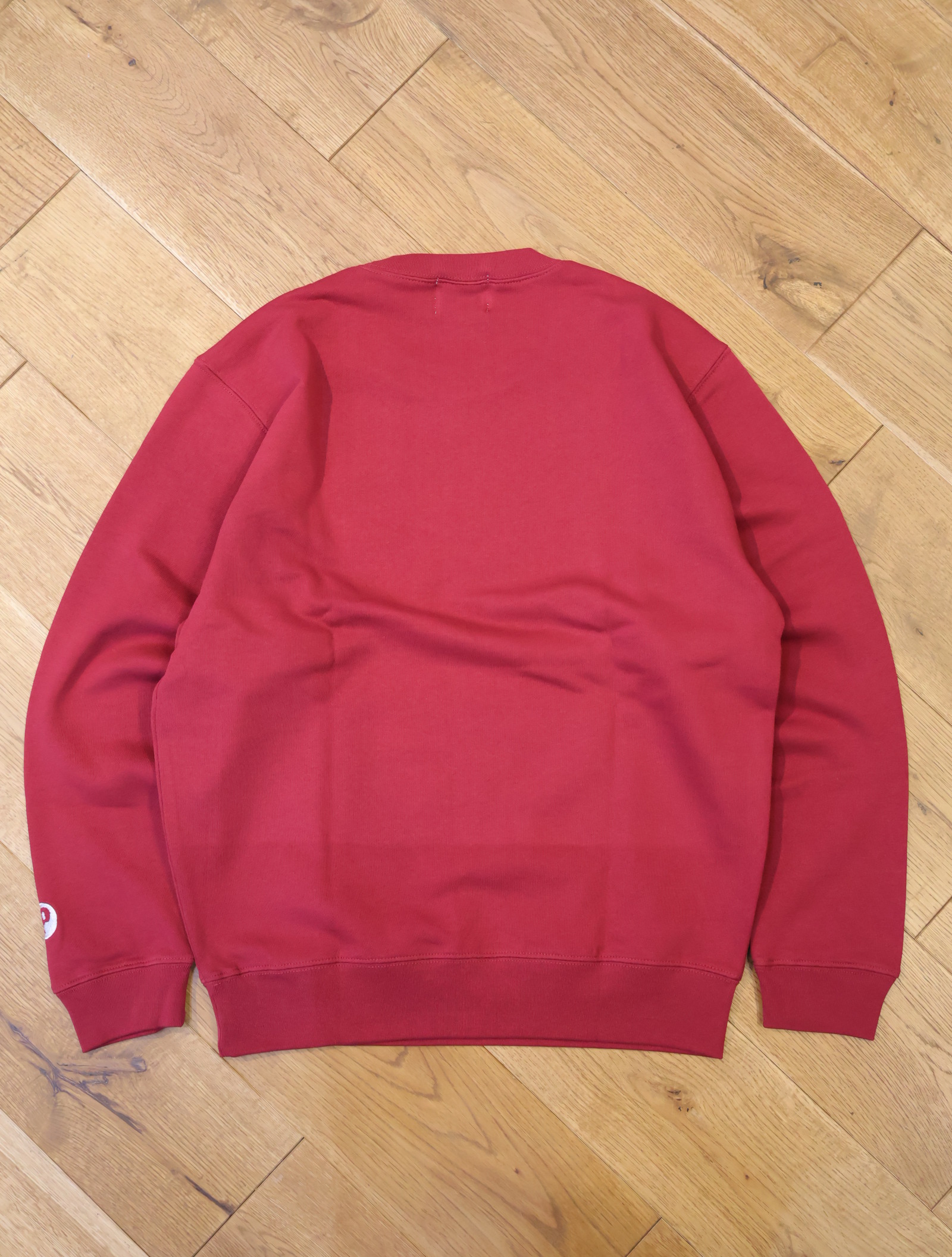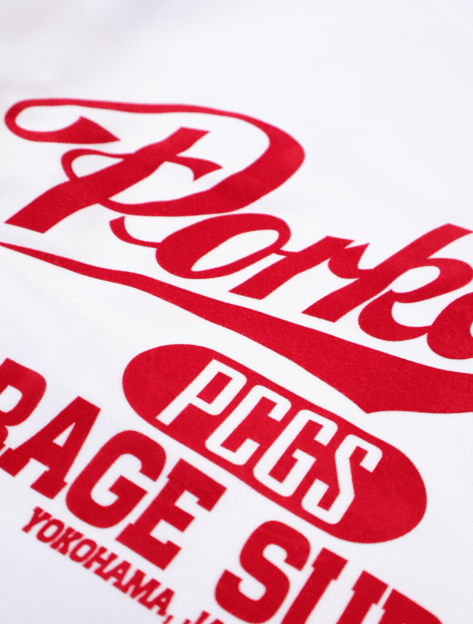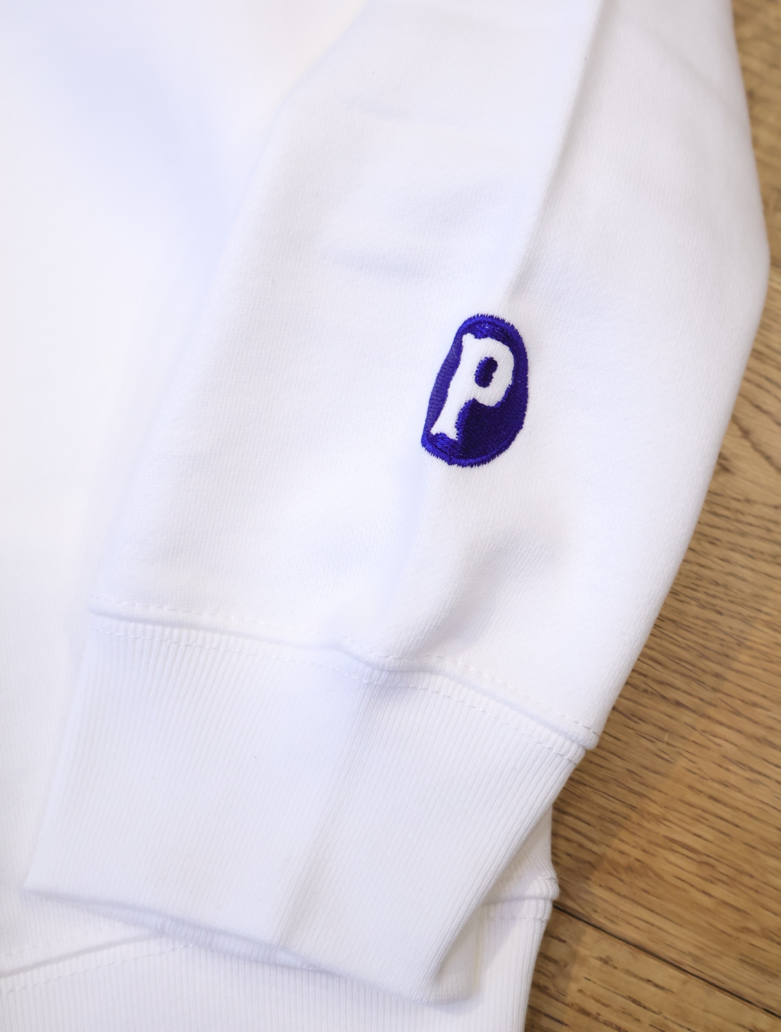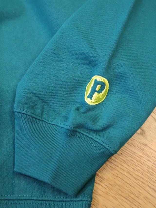 フロントにオリジナルのグラフィックがフロッキープリントで入り、左袖口に「P」の刺繍ワッペンが付きデザインのアクセントに。。