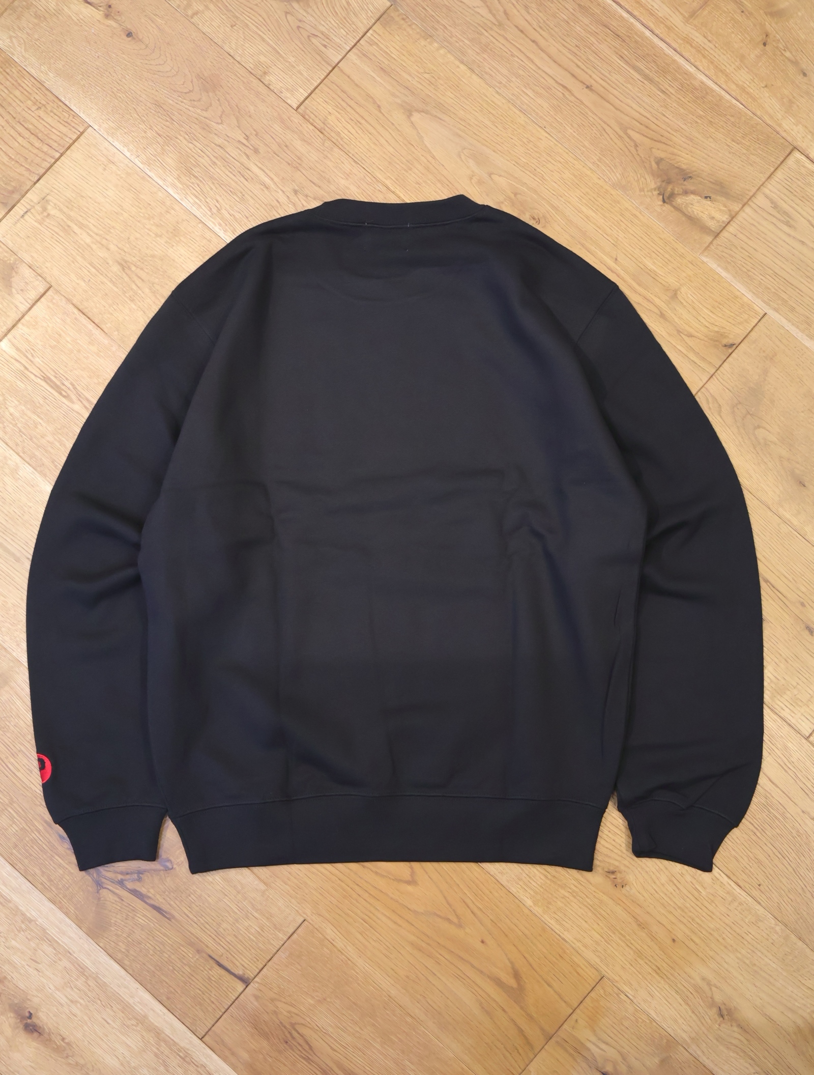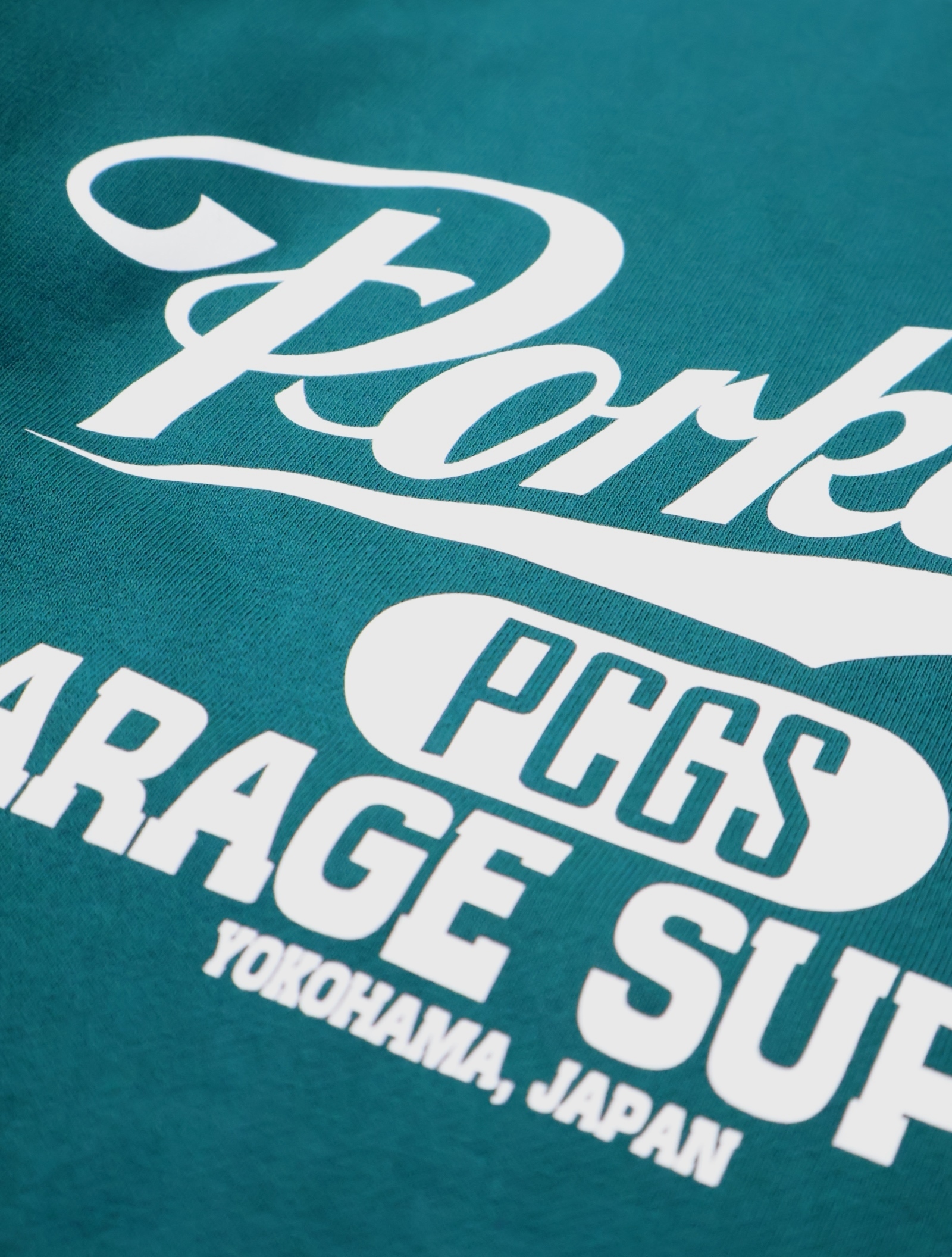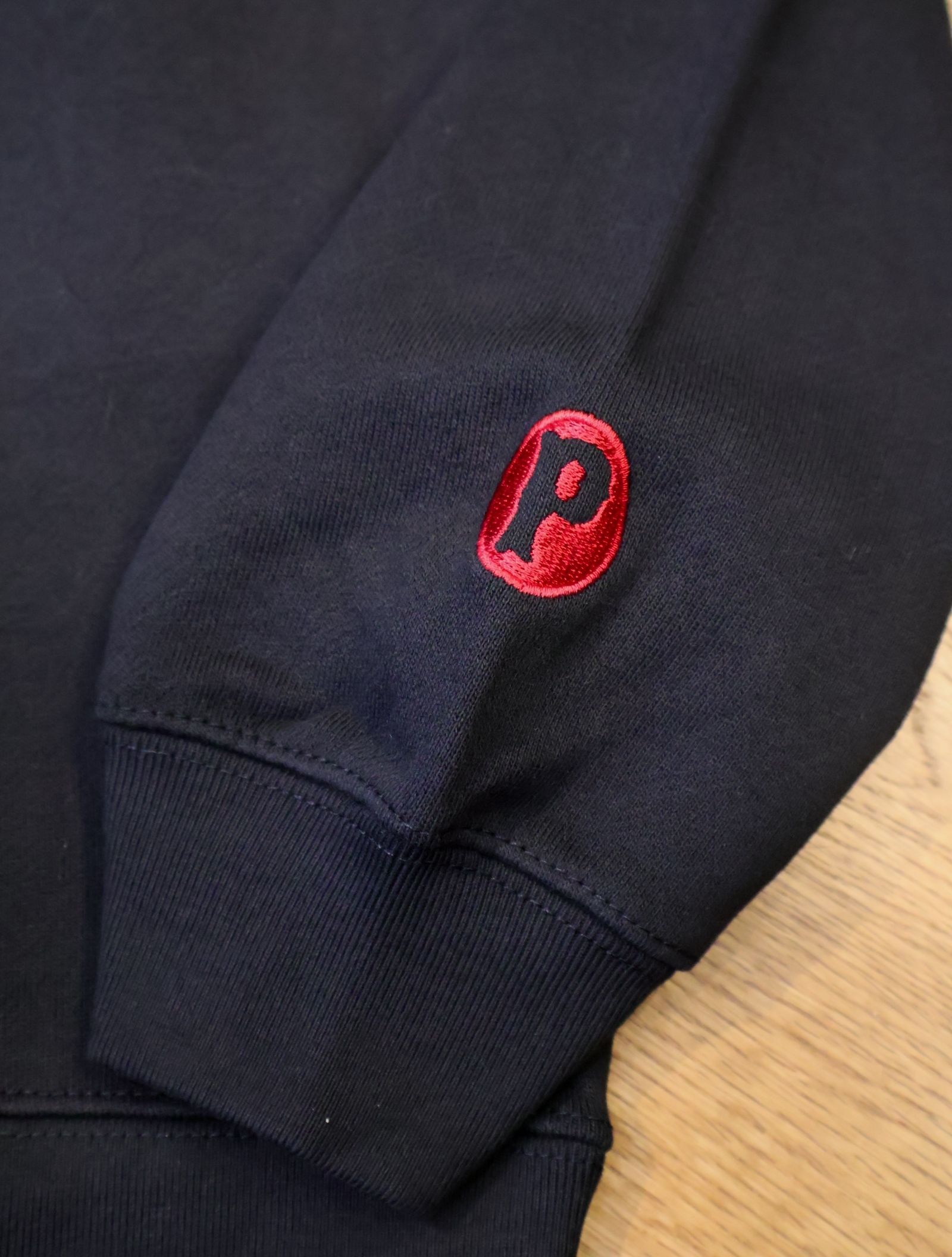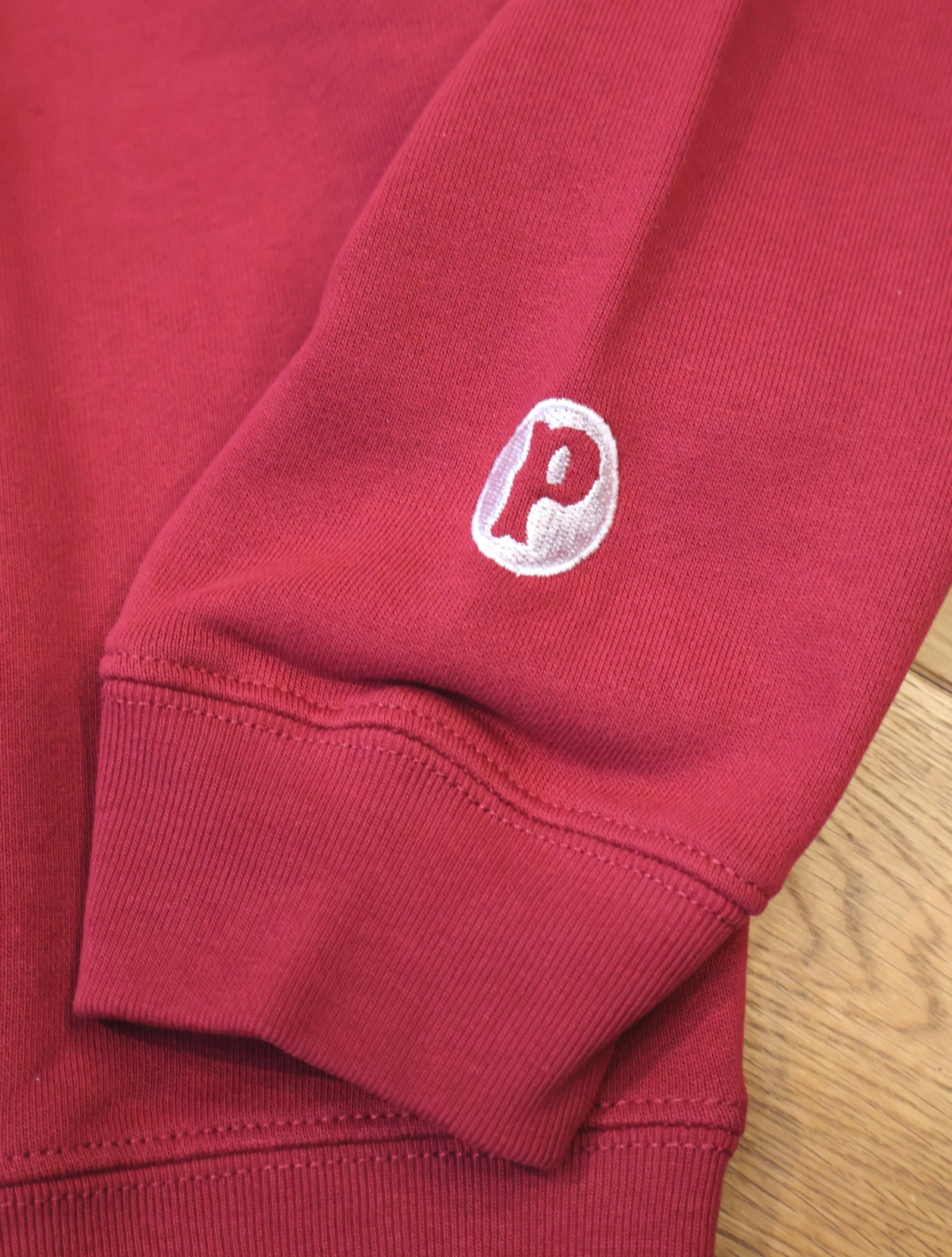 フロントにオリジナルのグラフィックがフロッキープリントで入り、左袖口に「P」の刺繍ワッペンが付きデザインのアクセントに。。