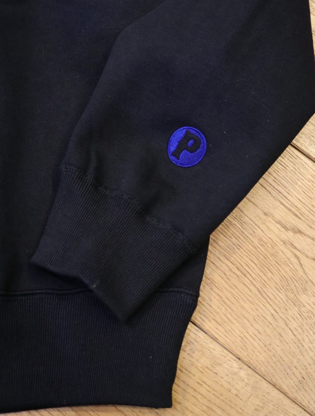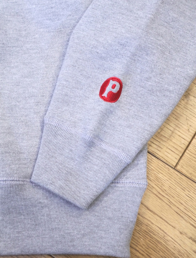 フロントにオリジナルのロゴ、バックにはスクエア型のロゴのプリントが入り、左袖口に「P」の刺繍ワッペンが付きデザインのアクセントに。。