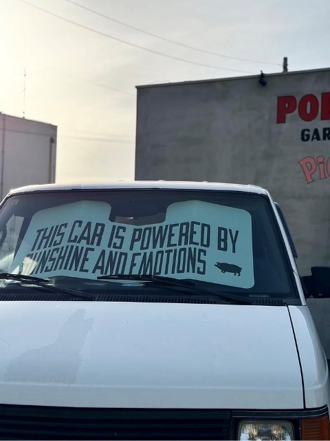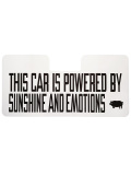表面には「THIS CAR IS POWERED BY SUNSHINE AND EMOTIONS」というメッセージと豚のグラフィック、裏面にはブランドのオーバルロゴがプリントで入ります。