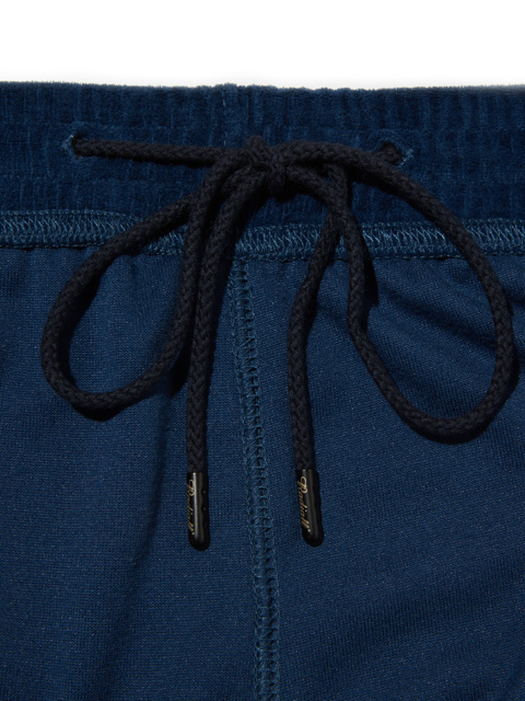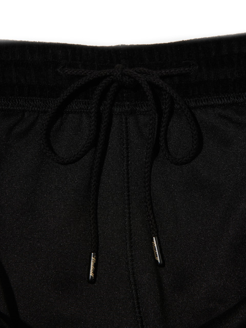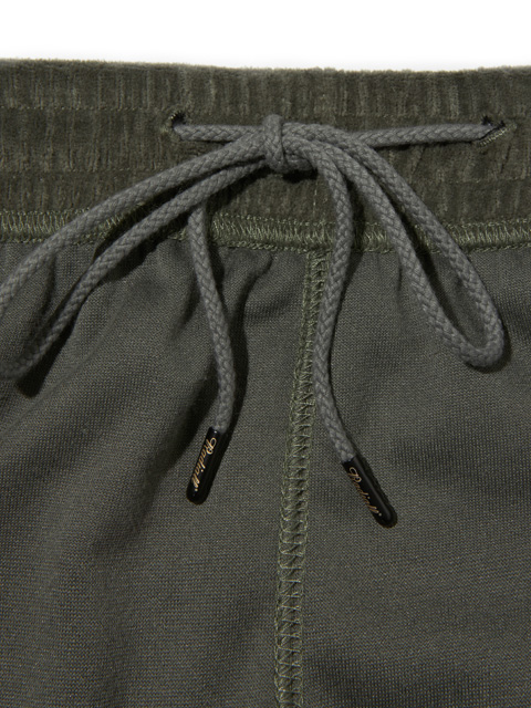 ウエストは平ゴムのギャザー、スピンドル仕様でアジャスト、ホールドでき、スピンドル先端にはブランドロゴが刻印で入る金属チップが採用されています。