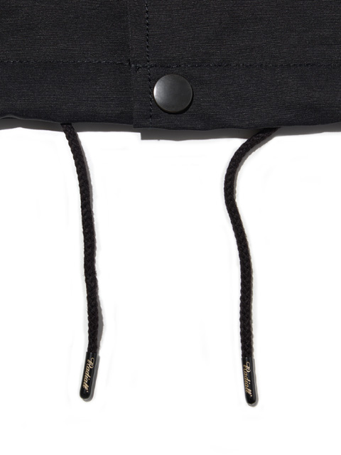 ウエストポケットはビンテージを意識して両玉縁、裾口のドローコードの先端にはブランドロゴ入りの金属製チップ付き。