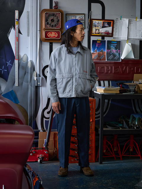 また、バイオストーンウォッシュ加工と縫製仕様に巻き縫いの二本針を選択したことでジャケットに立体感と味が生まれ、モーターカルチャーとワークテイストを強く感じる印象に。