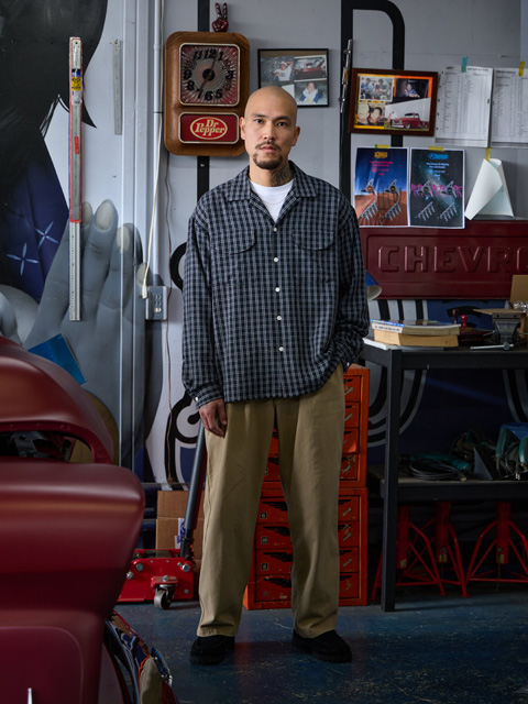 生地に細かい格子柄で捻り杢を使用した、立体的な生地表情が特徴のオリジナルのドビーチェック生地を採用し、クラシックな表情でありながらブランドの持つ音楽やモーターカルチャーの世界観を内包しています。