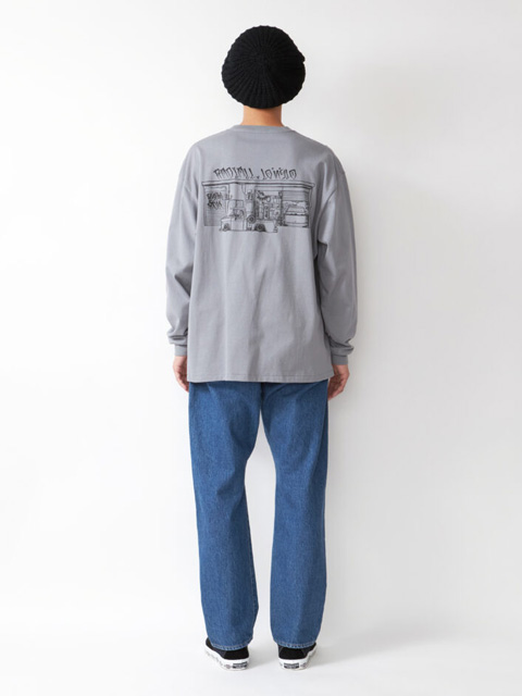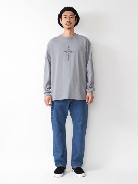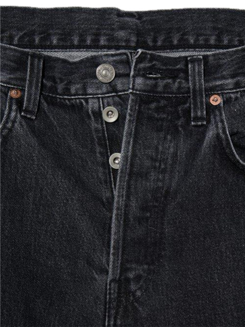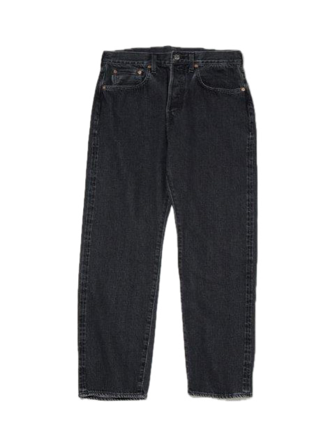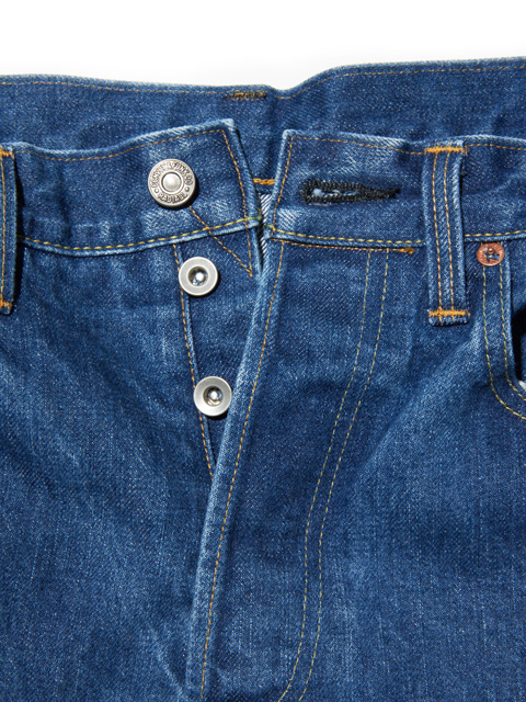 ヒップ、股上、ワタリに適度にゆとりを持たせたストレートシルエットで、ボタンフライ仕様。