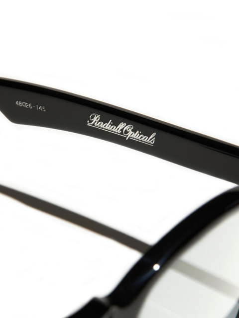 左テンプルに「Radiall Opticals」とサイズスペック、右テンプルには「FIFTY NINE」が箔押しで刻印されています。