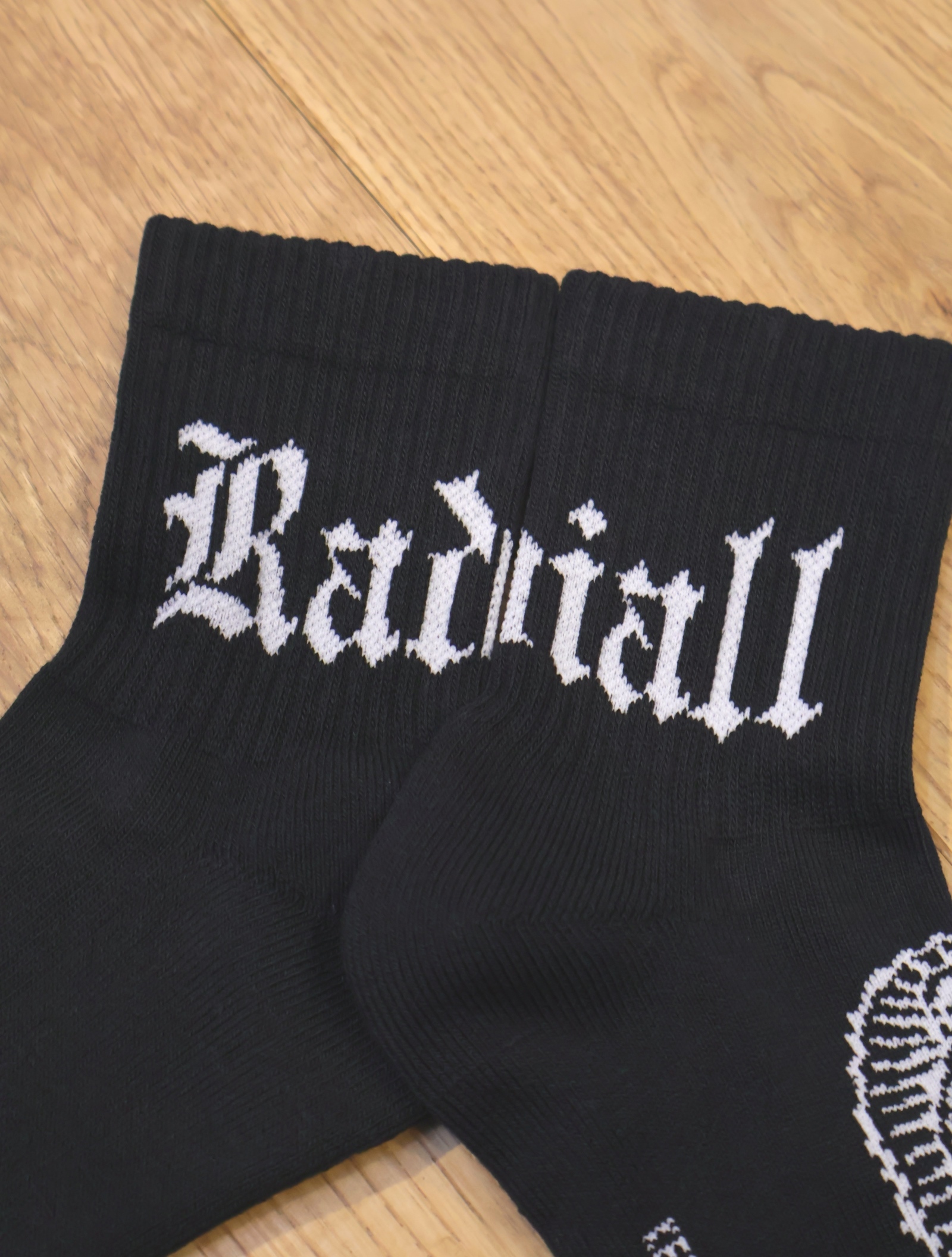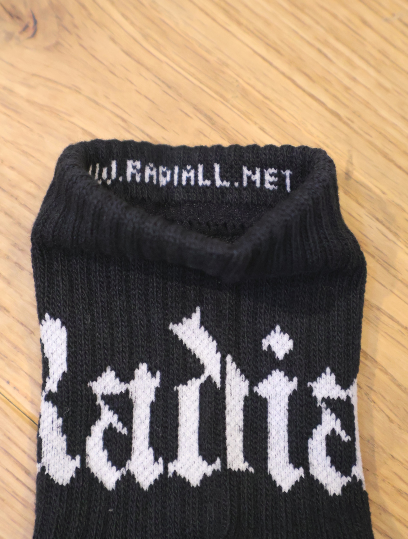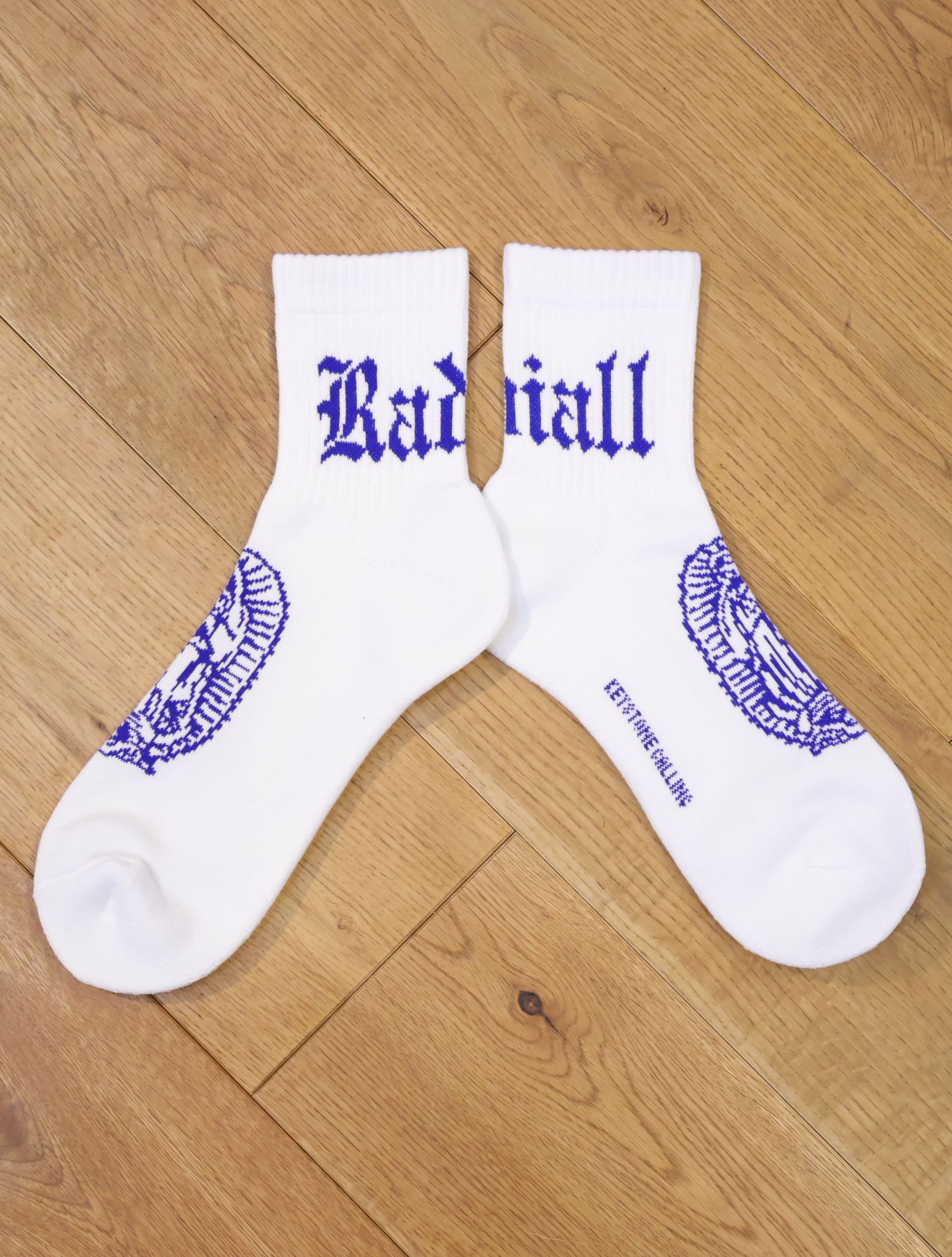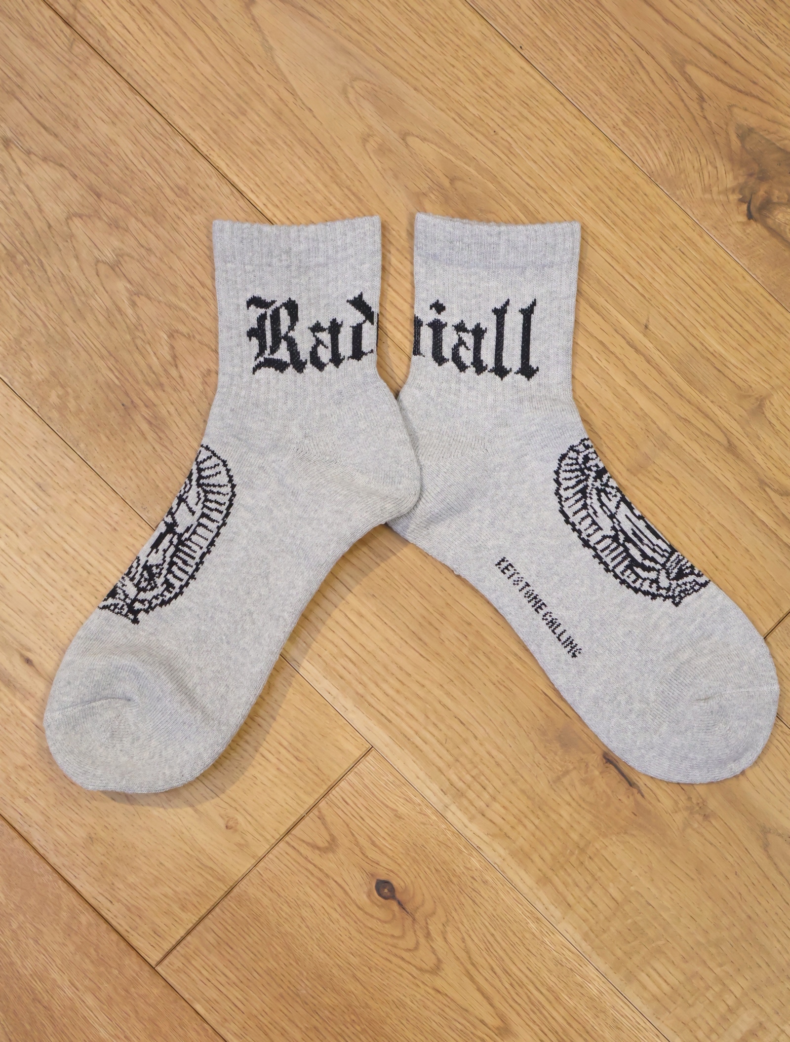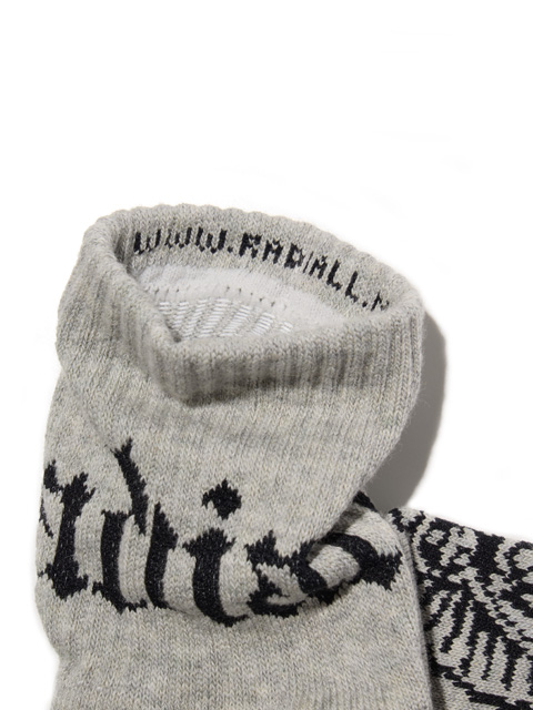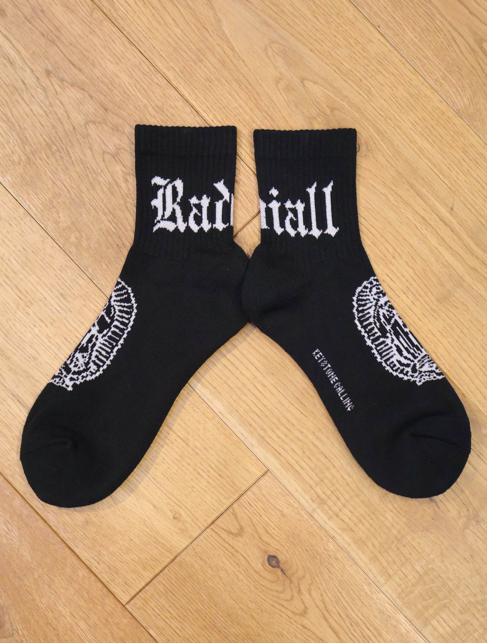 ジャガードで足首裏にブラックレターフォントで「RADIALL」、甲に「レコードマリア」、履き口裏には「WWW.RADIALL.NET]、足底には「KEYSTONE CALLING」とデザインが入ります。